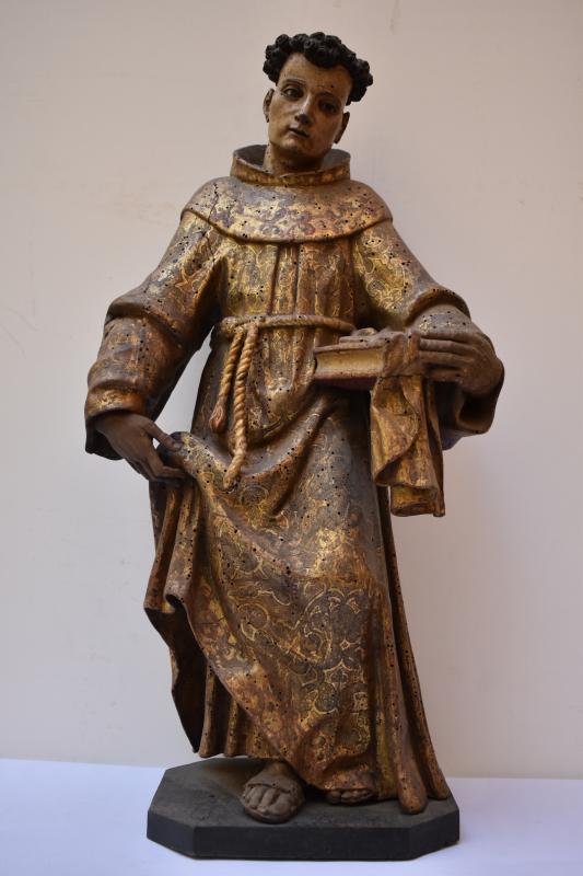El santo muestra los atributos tradicionales de la Orden: hábito marrón, cíngulo y sandalias, todo ello magníficamente estofado.