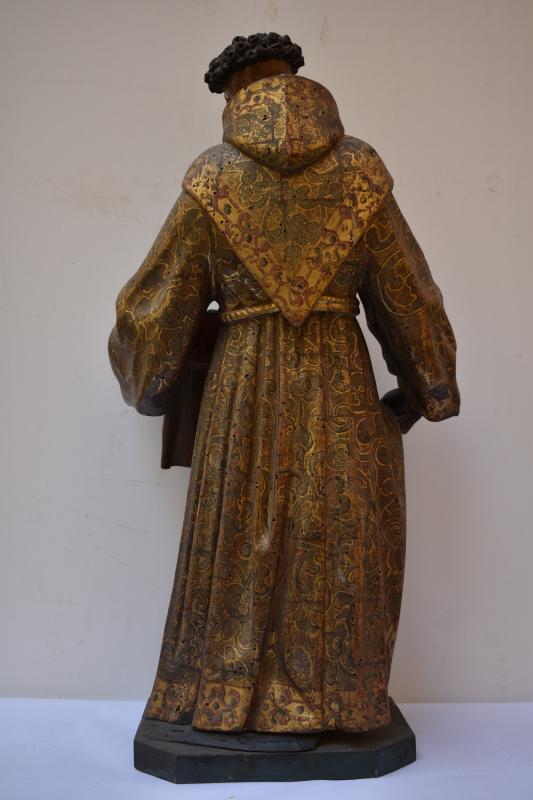La cogulla, sobre la espalda, sobre amplio escapulario descubren una magnífica talla barroca, de actitud contenida y concentrada.