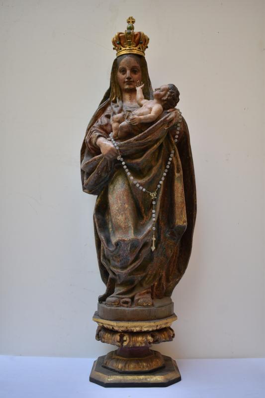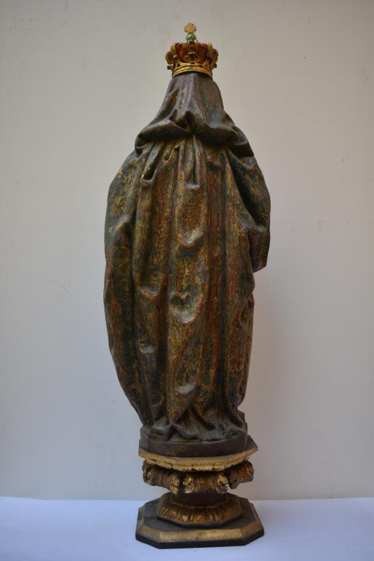 Virgen de pie con Niño sobre peana solidaria (alzada por otra peana, posterior).