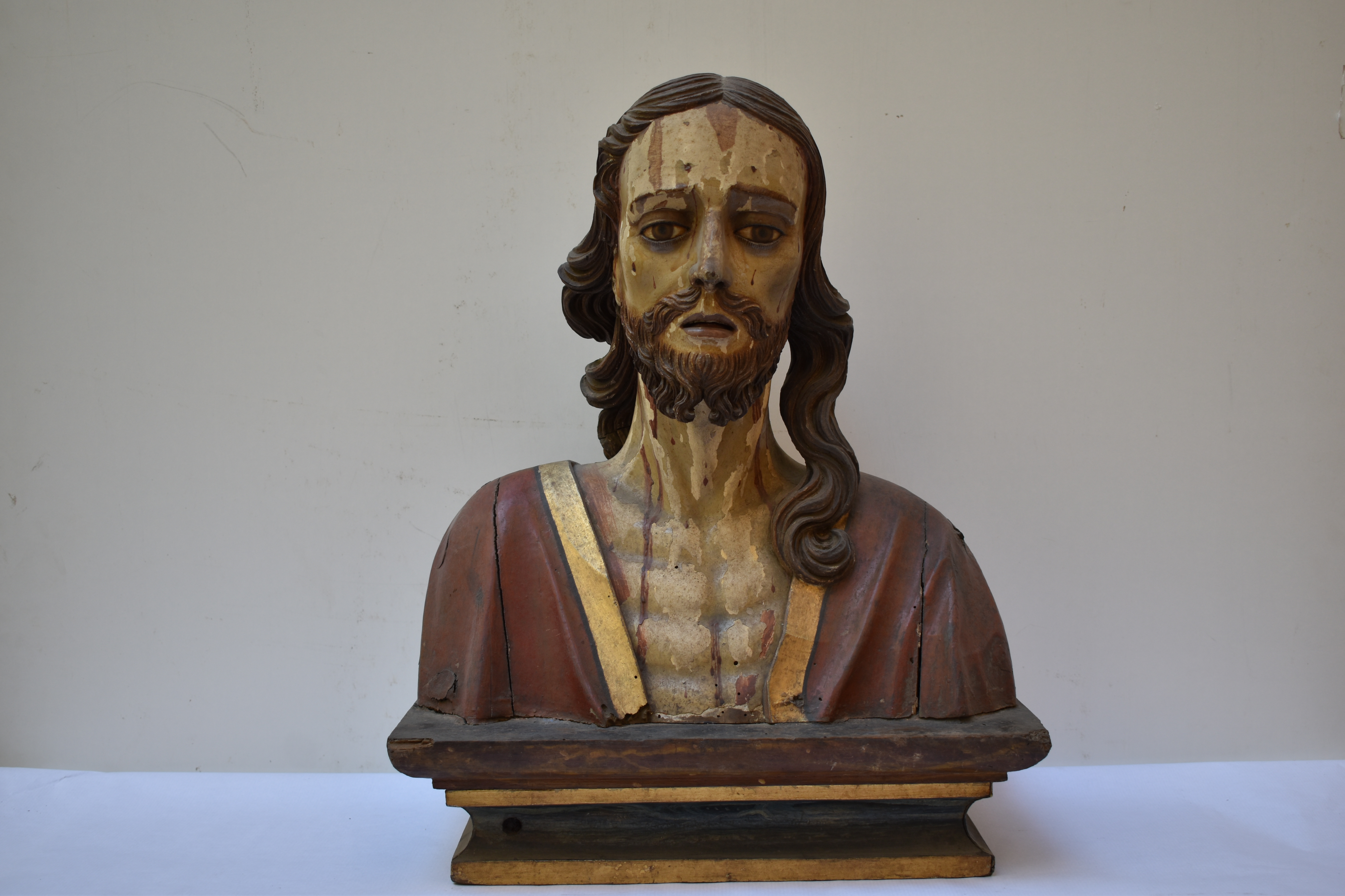 Busto sobre sencilla peana moldurada (que le pertenece) de un Ecce Homo reconocible con el gran mechón de cabello que resbala hacia el hombro izquierdo, separado de la cabeza en su parte central.
