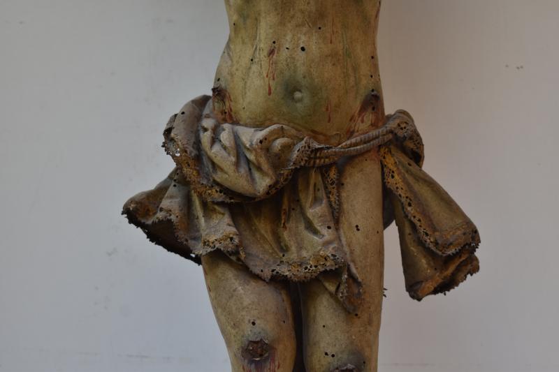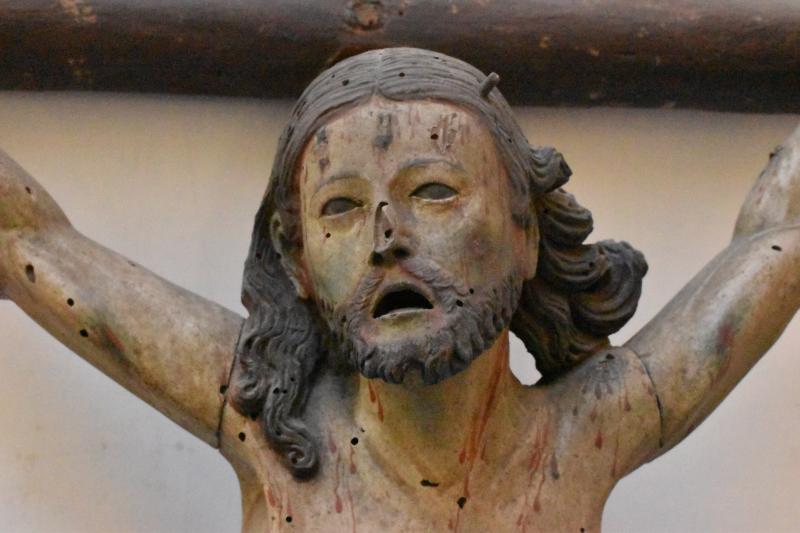 Perdió el rotulus y la corona de espinas, de la que conserva algún resto en la cabeza.