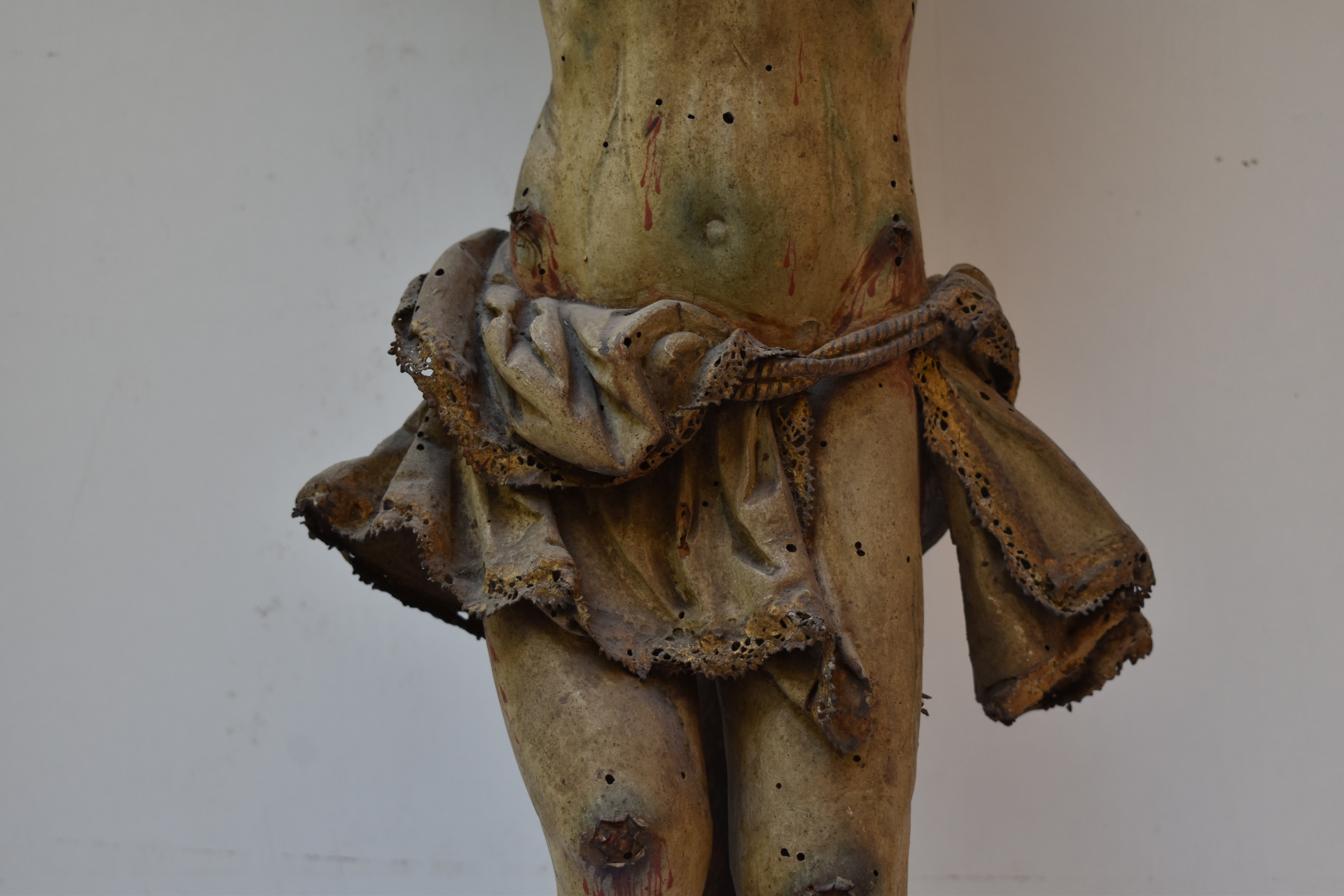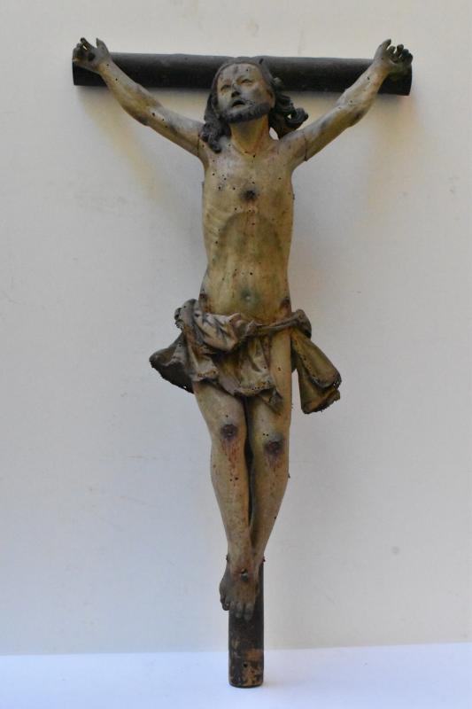 Cristo en la cruz de hechura popular, lo que se muestra en el deficiente manejo de la anatomía, con brazos excesivamente cortos. La cara expresa rasgos patéticos, acentuados por la boca muy abierta.