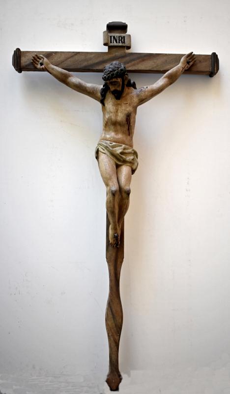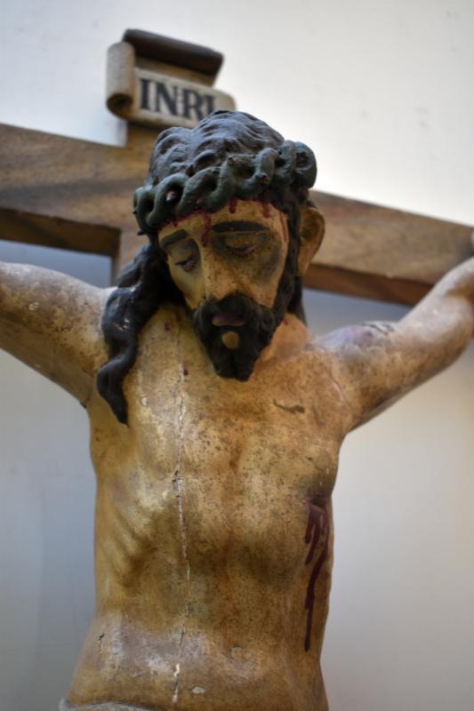 El Cristo, de tres clavos, mira hacia abajo. Porta corona de espinas solidaria (casi una gruesa diadema), muestra buenas proporciones anatómicas, si bien el torso se muestra muy plano, quizá consecuencia de sucesivas repolicromías.