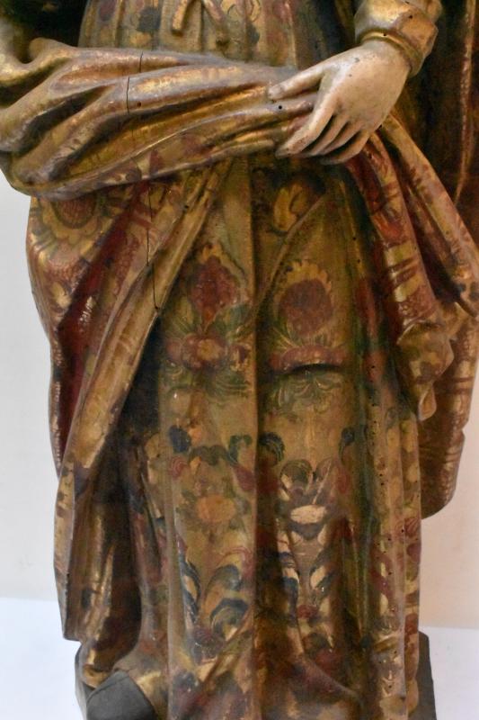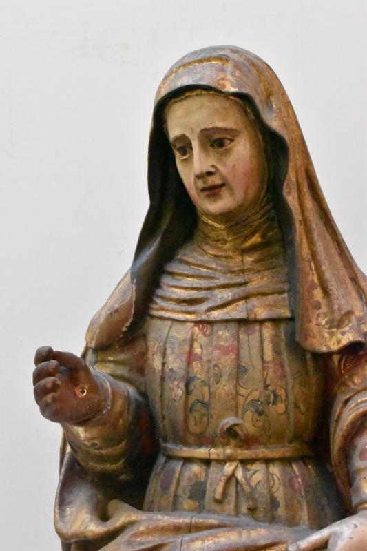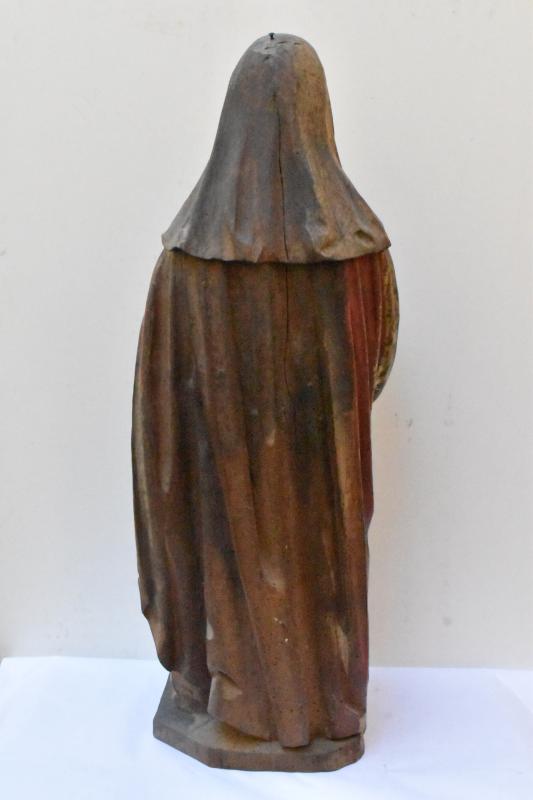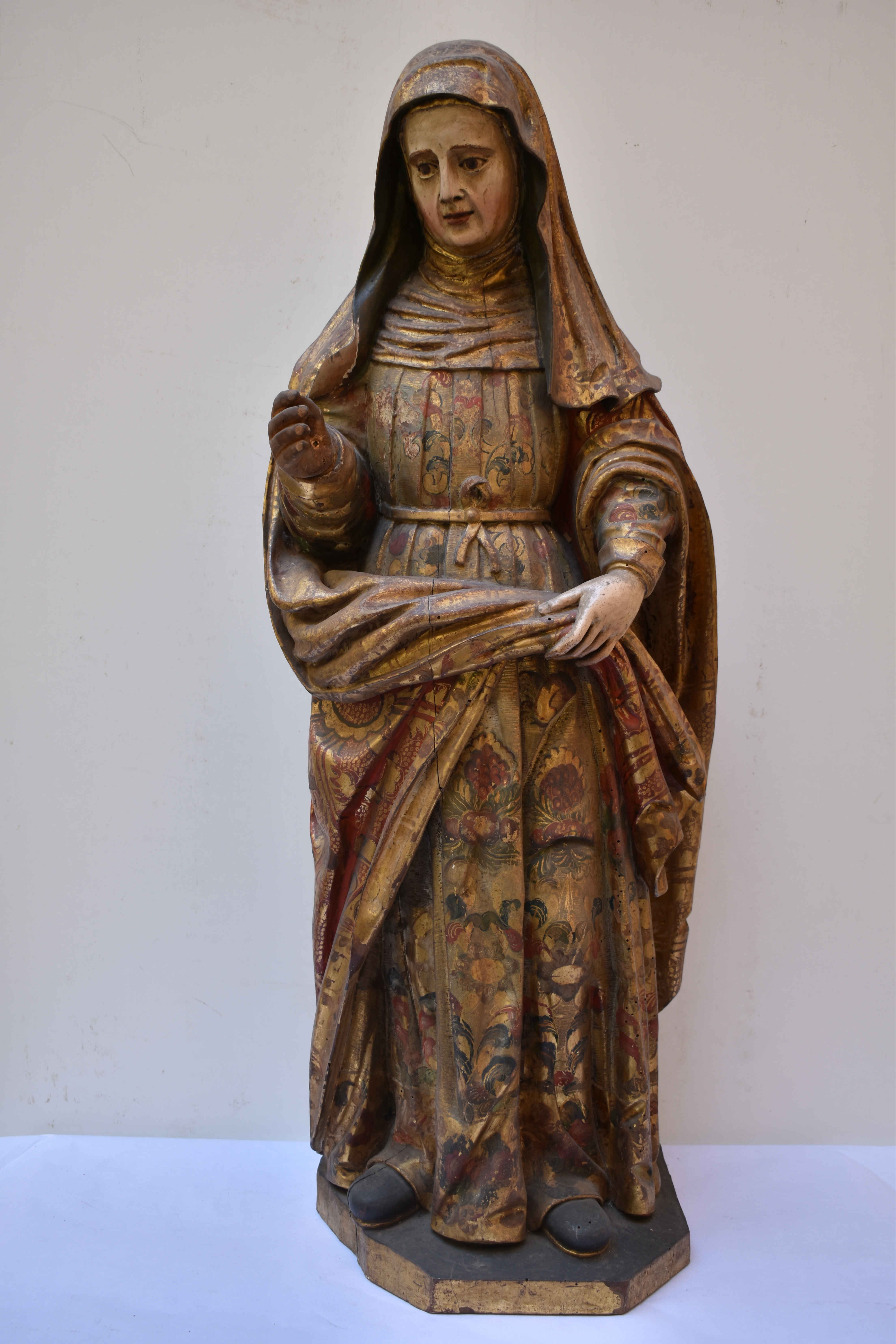 Monja de pie ataviada con hábito franciscano estampado todo él de motivos florales. Recoge el pliegue del mismo con su mano izquierda por debajo de la cintura (ceñida por cinta, no por cíngulo). La toca cubre la cabeza y oculta el cuello en delicados pliegues longitudinales que contrastan con los verticales del cuerpo. Por debajo del hábito, la camisa de lino hasta la muñeca, que se aprecia en el brazo derecho.