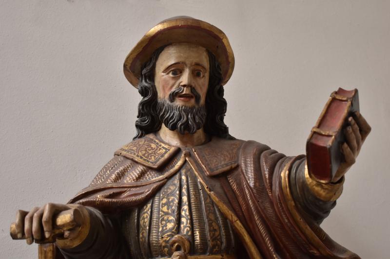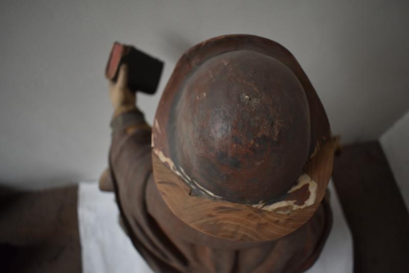 La parte del ala en la parte posterior del sombrero está repuesta mediante un injerto de madera sin policromar