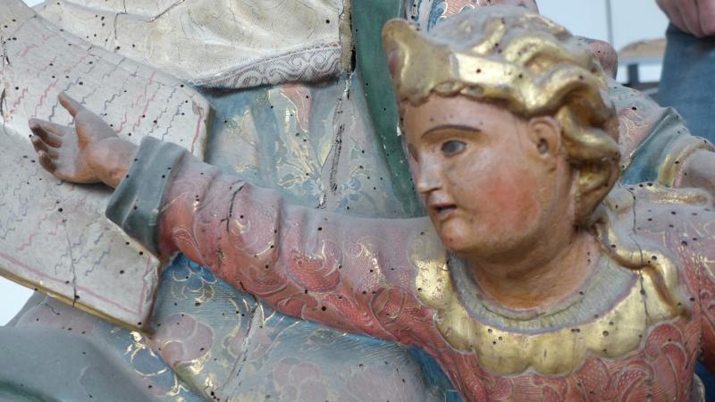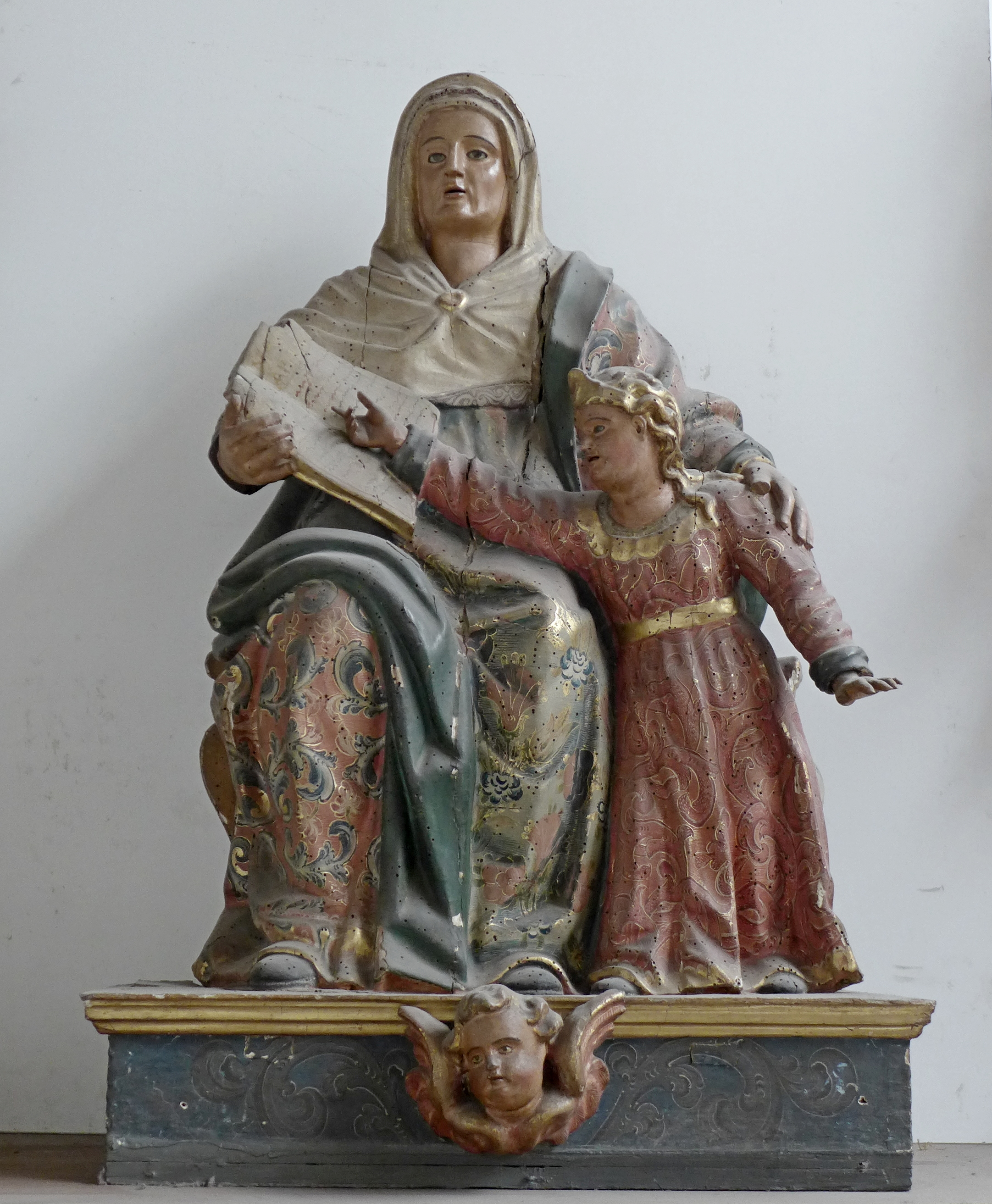 Conjunto escultórico sobre peana solidaria ornada en su parte central con una cabeza de serafín alado.