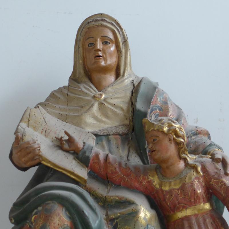 Santa Ana porta toca, que no deja ver el cabello y le cubre todo el pecho, vestido y manto, ambos estampados con flores. La pequeña Virgen lleva un vestido rojo.