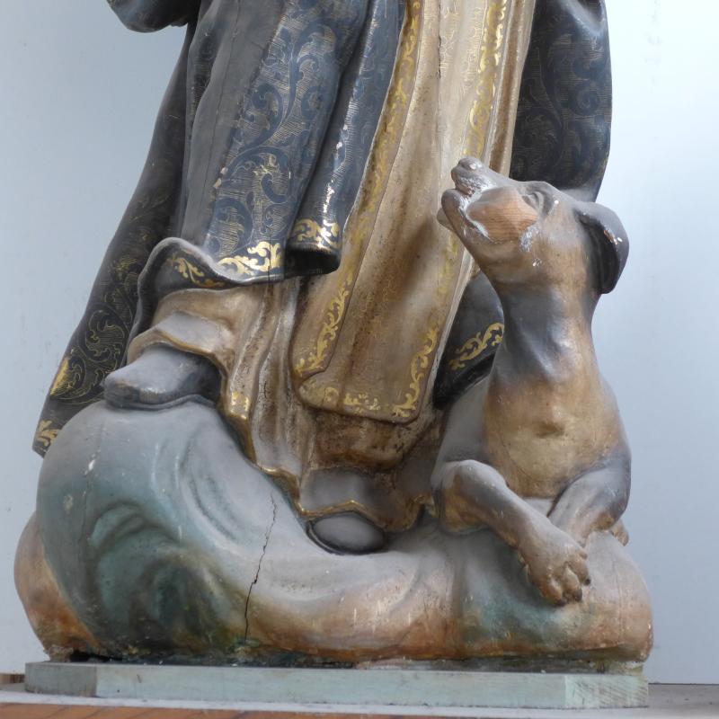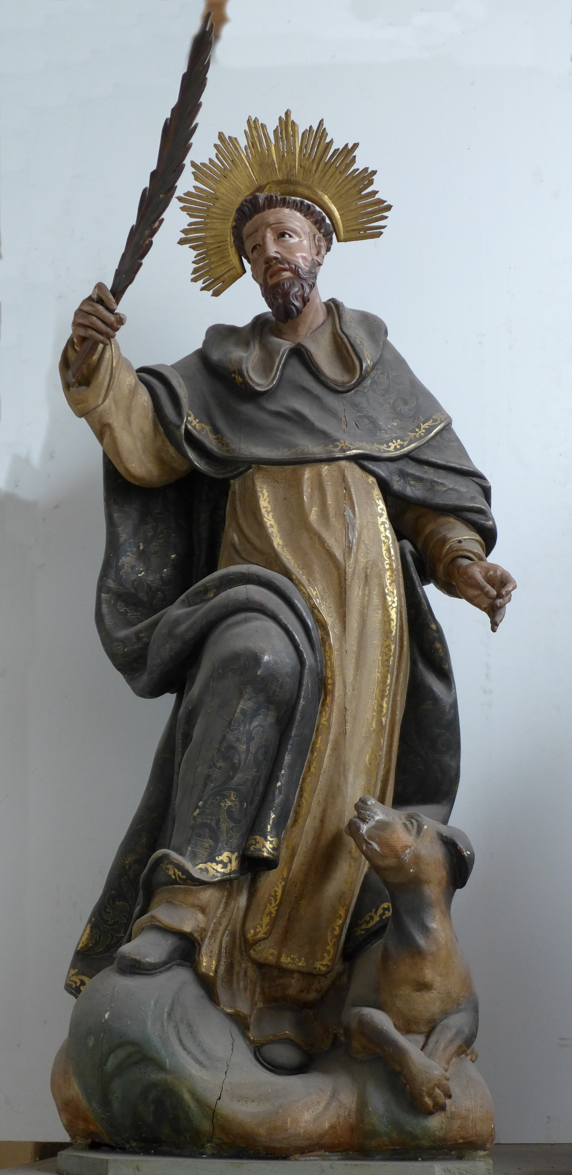 Talla de tamaño natural que representa al dominico valenciano de pie sobre una roca, en inestable equilibrio para provocar un escorzo. Un perro (Domini canis) se sitúa a sus pies.