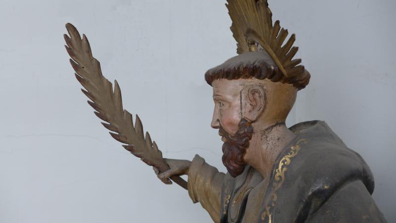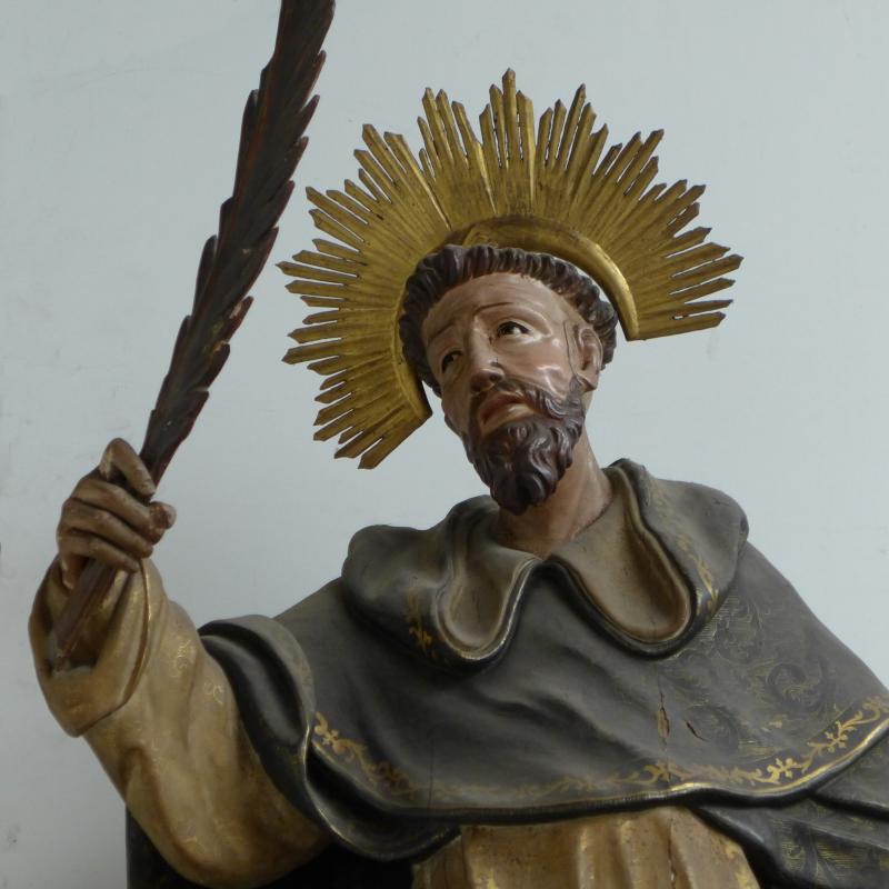 Su cabeza, de amplia tonsura y discreta barba triangular, se adorna con un halo dorado (que le pertenece).