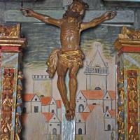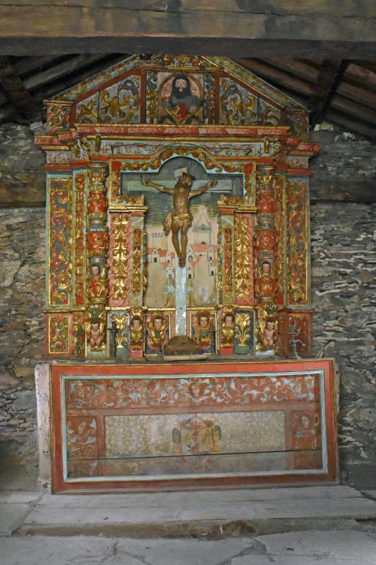 Retablo hornacina, policromado y dorado, que consta de banco, un cuerpo y ático, pensado para acoger al Crucificado en su única hornacina crucífera, avanzada con respecto al frente del mismo. Está flanqueado por dos columnas abalaustradas. El ático consiste en un simple piñón, con un relieve central con la figura de Dios Padre enmarcado por dos cabezas de ave, también en relieve. El fondo de la hornacina muestra una tabla con esquemática representación urbana, en representación de la Jerusalén celeste.