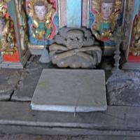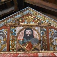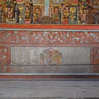 Todo el retablo, policromado y jaspeado, se abarrota de golpes de talla dorados. Tan solo dos angelitos a modo de tenantes sostienen las columnas en las ménsulas del banco del retablo, y cabecitas de querubines se distribuyen en relieve por distintas partes del mismo.