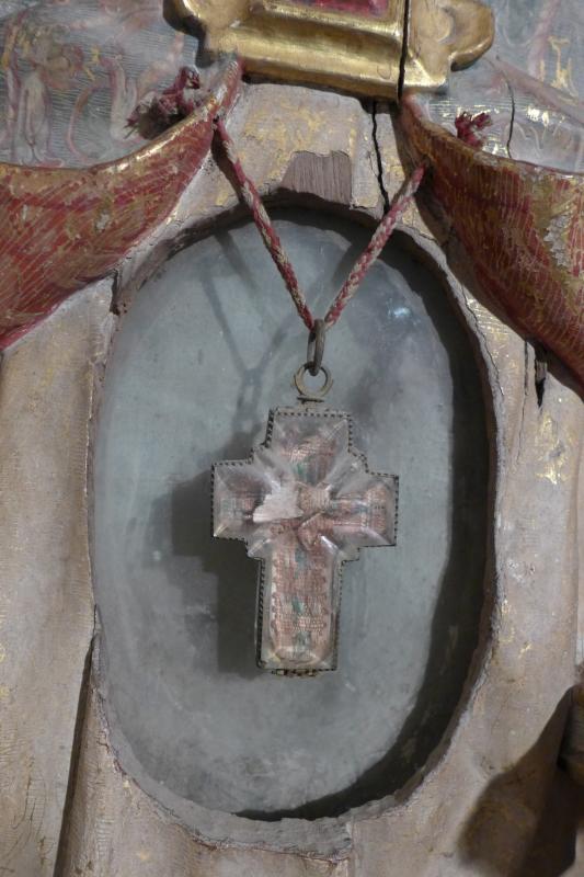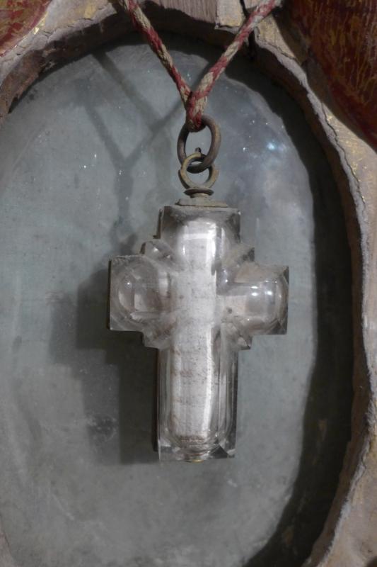 Dentro del cristal de la cruz hay un papel doblado escrito, seguramente la auténtica, con una letra que aparenta ser del siglo XVIII (examen sin abrir el relicario)