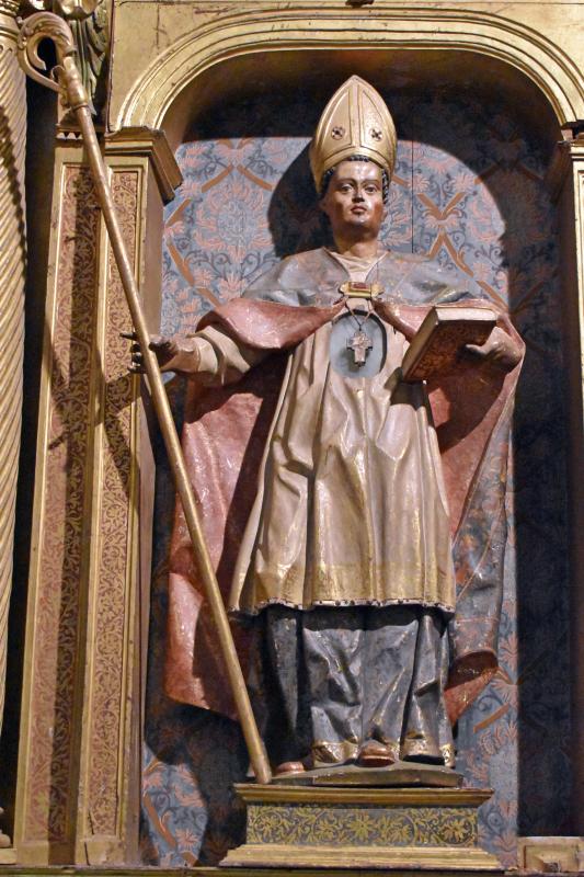 Santo mostrado frontalmente y de pie, con la mirada perdida. Porta los atributos episcopales (mitra, báculo, guante). Viste túnica, sobrepelliz y capa pluvial cogida por un prendedor en el pectoral, cuyos pliegues se desenvuelven con cierta simetría. Del manto pende una pequeña cruz latina de cristal de roca con funciones de relicario que acoge en su interior un fragmento textil. Además, en dicho pectoral se abre un hueco para depósito de reliquias cubierto por un vidrio. Sostiene un libro cerrado en su mano izquierda. Su asienta sobre una peana exenta.
