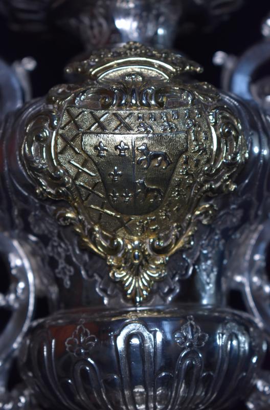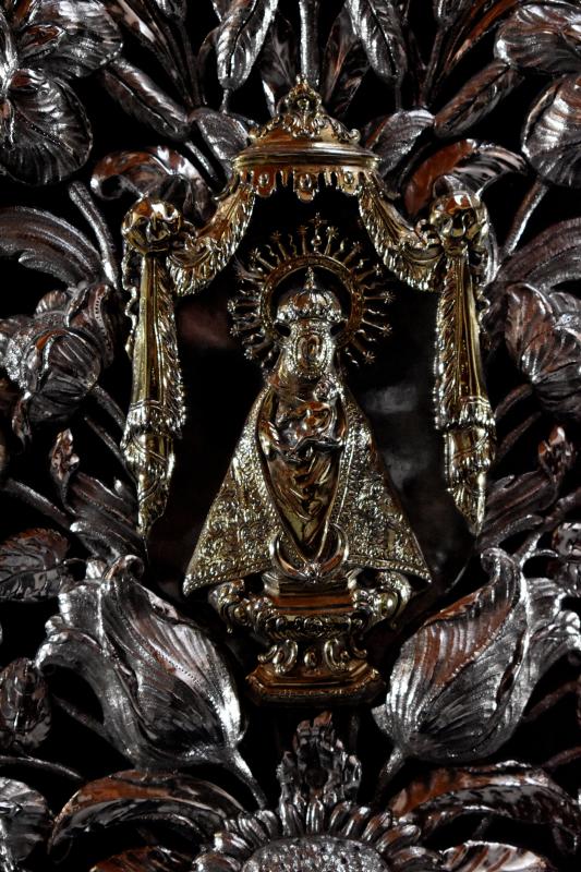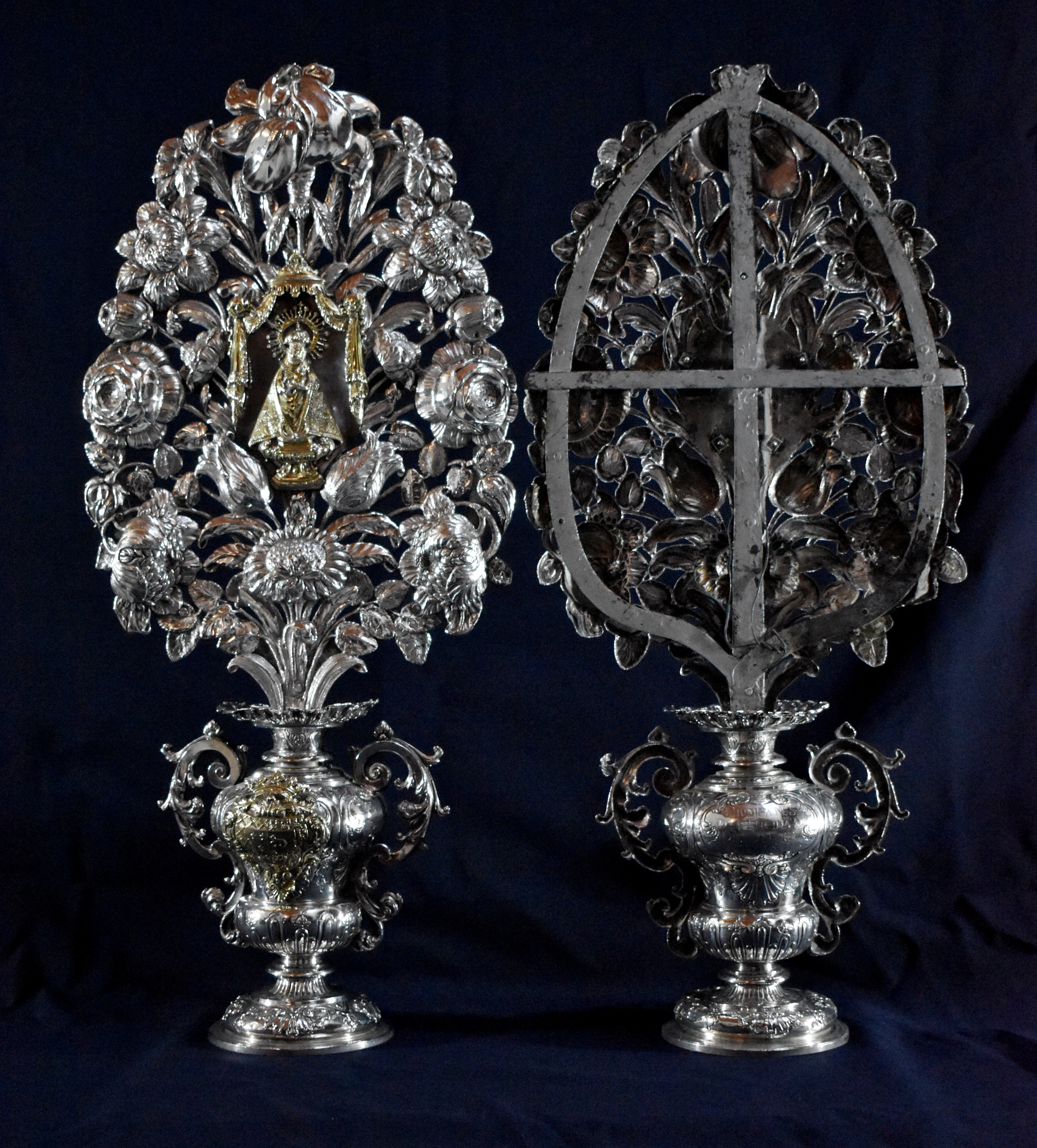 Este juego de ramilleteros es una excelente muestra de la pujanza de los talleres salmantinos de platería durante el siglo XVIII. Son todo un despliegue de platería barroca y rococó. Cada uno de los ramilleteros se compone de un jarrón de cuerpo bulboso, pie moldurado, cuello cilíndrico y dos asas en forma de tornapuntas vegetalizadas. Su superficie va cuajda de rocallas, ornatos vegetales, colgantes floradles, gallones, ces...y dos cartelas de movidos perfiles, una con la inscripción de donación del conjunto, otra con las armas heráldicas del obispo. Como si de un ramo de flores se tratara, del jarrón nace un ostentosa composición de flores y hojas de diversos tipo elaboradas en chapa de placa repujada (reforzadas en su anverso por una estructura de hierro), y en su centro una imagen dorada de la Virgen de la Encina bajo los habituales cortinajes y guardamalletas.