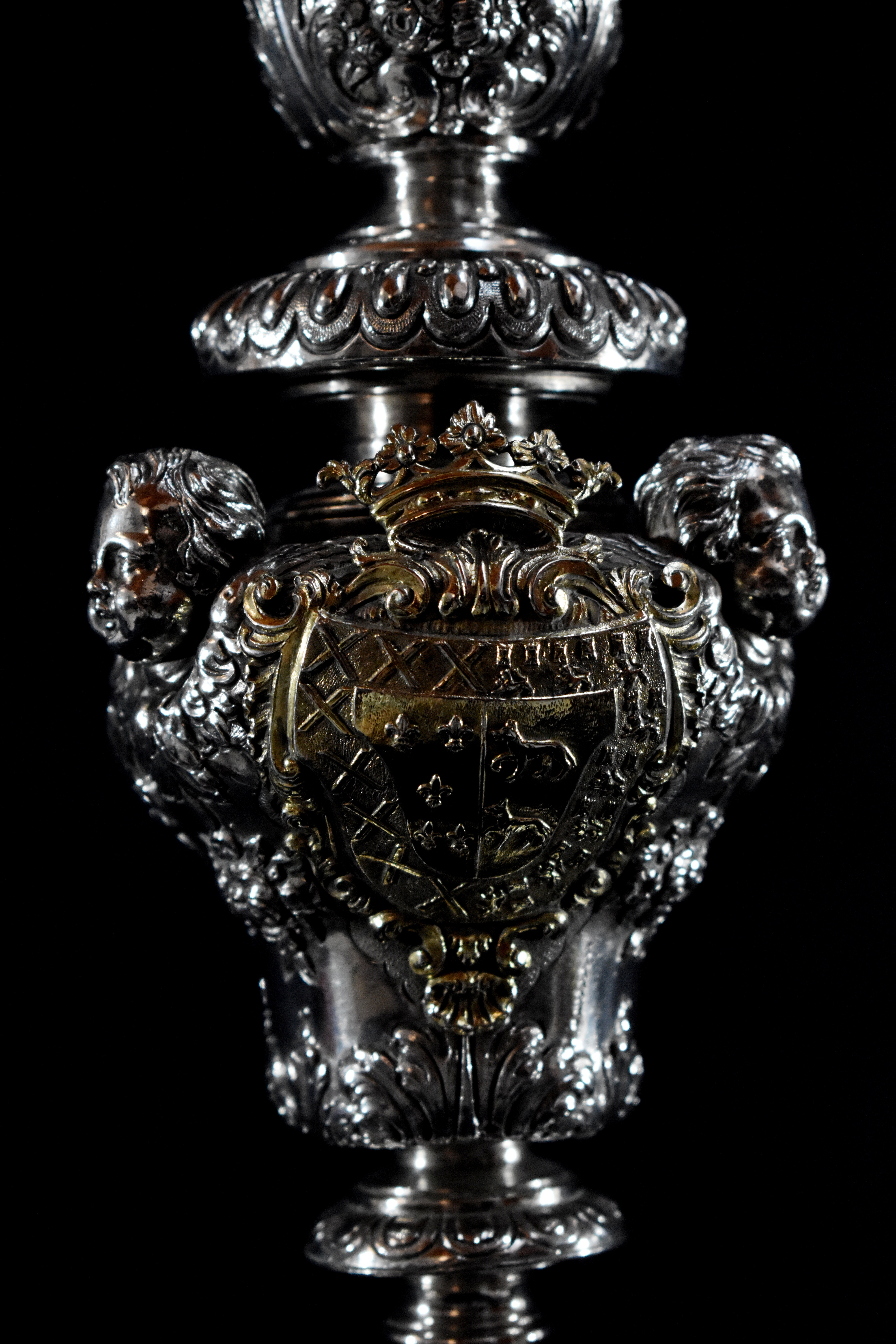 Aunque estas dos parejas de candeleros se elaboraron en dos centros plateros distintos, siguen una misma tipología muy habitual en la segunda mitad del siglo XVIII. Los de mayor tamaño, como otras de las piezas legadas por el obispo Flórez se encargaron en Salamanca, palpable en su mayor riqueza y finura de talla. Las menores, vinieron de Cuenca, una de las sedes que Flórez Osorio ocupó como obispo. Cuentan con tres patas, unas en forma de garra animal, las otras de espiral, sobre las que se alza una base prismática de perfil triangular y bordes tornapunteados, un vástago abalaustrado y un mechero cilíncrico recogido por una taza circular y convexo. En los de mayor tamaño la decoración resulta muy profusa, dentro de repertorio rococó, portando en su base, además, una medalla dorada con la Virgen de la Encina y otra con la inscripción de donación. En el nudo, además de cabezas de querubes, son visibles las armas del obispo.