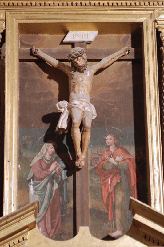 Sobre un fondo neutro destacan las figuras de María y San Juan Bautista, que flanquean el Cristo de talla. Ambos personajes están de pie y nimbados, en actitud convencional. La Virgen está en actitud de oración con vestido rojo, manto azul y toca blanca, con los ojos entrecerrados hacia el suelo. El Bautista, barbilampiño, cruza sus brazos sobre el pecho, lleva vestido oscuro y manto rojo, dejando descubierto un pie descalzo. Una ciudad (Jerusalén) se perfila en segundo plano, con una portada y cubo de muralla, sobre la que descollan diferentes torres.