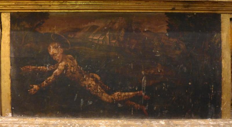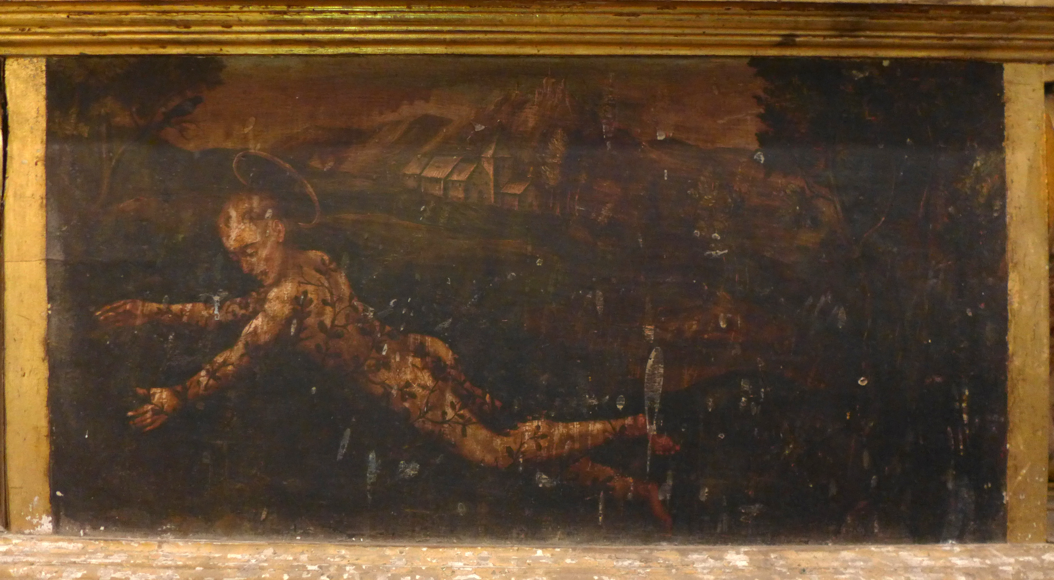 Pintura sobre tabla. San Benito arrojándose a un zarzal