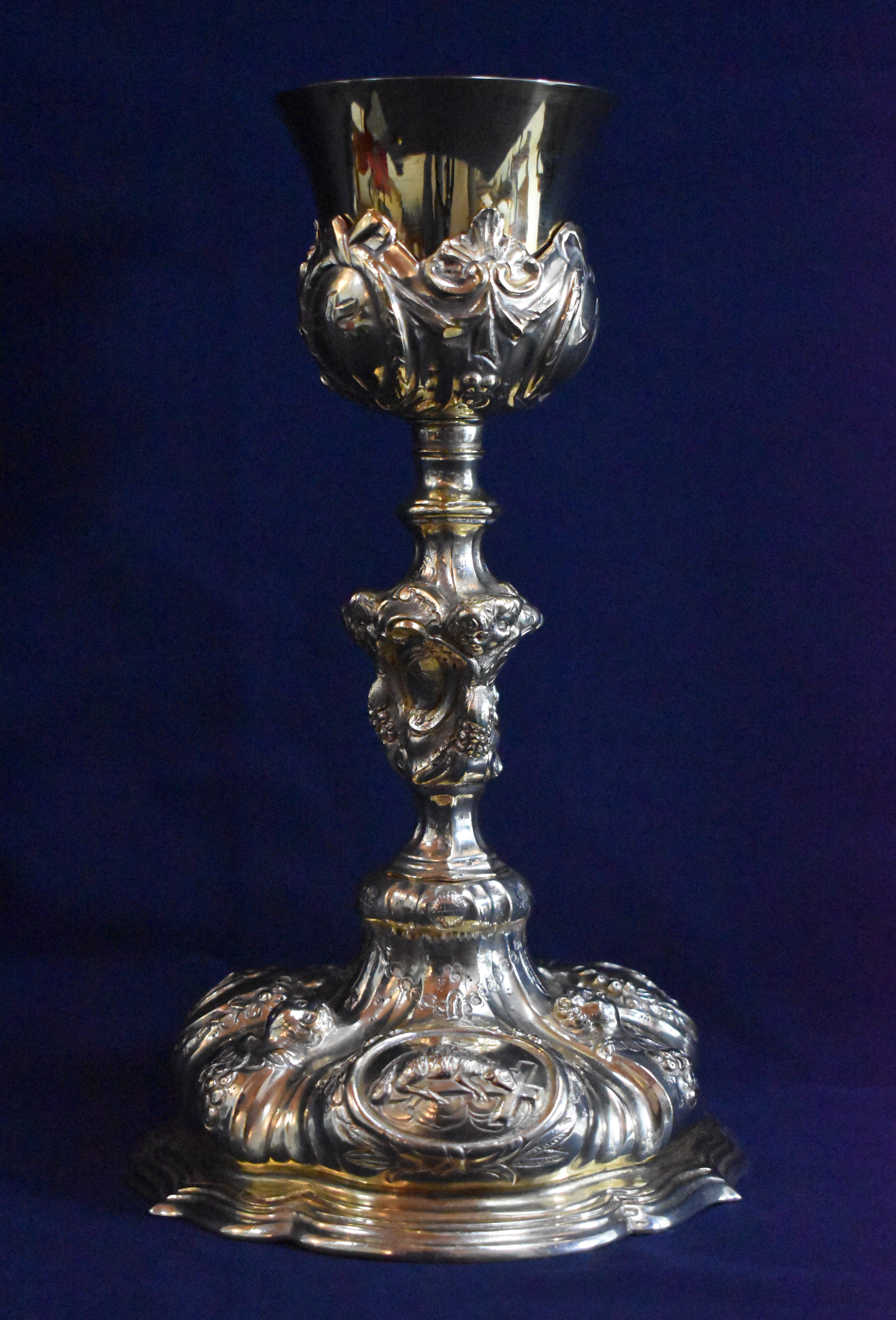 Magnífico cáliz de finales del siglo XVIII y procedencia cordobesa, baste con contemplar su depurada técnica y exuberancia decorativa. Todo él está concebido como un inmenso motivo ornamental, la estructura queda diluida tras el abundante repujado y cincelado que la encubre. No obstante, consta de basamento liso de perfil ondulado, traza que mantiene el cuerpo dispuesto sobre él. El astil queda reducido al nudo, que está flanqueado por leves molduras, aunque el nudo adopta una estructura troncopiramidal invertida. La copa adopta forma de campana, algo más de su altura total está cubierta de motivos repujados. La decoración general utiliza espejos ovales, motivos vegetales, ces arrocalladas y cabezas de querubes. En base, nudo y subcopa se crean una suerte de cartelas con los Arma Christi (Agnus Dei, Cruz, Dados...) y Símbolos Eucarísticos (Pelícano picándose el pecho...)