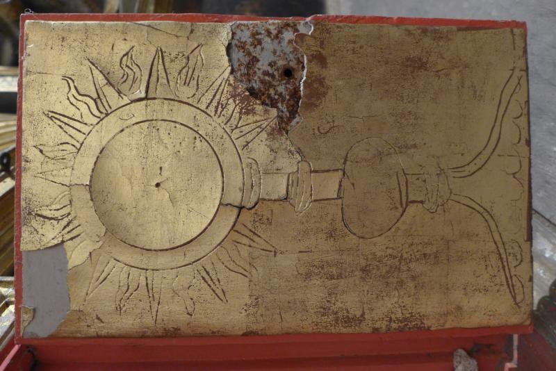 La parte posterior de esta portezuela, toda de pan de oro, muestra un ostensorio, con pie, macolla y viril.