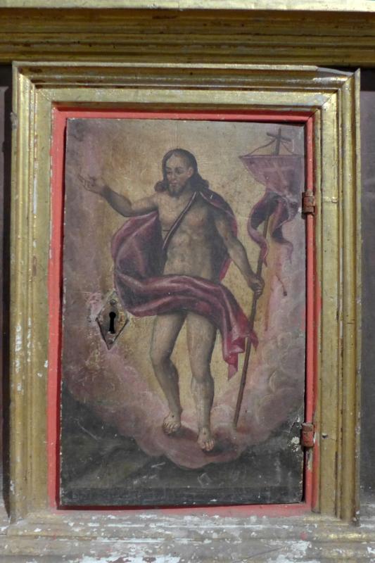 Cristo, de hercúlea anatomía pero con ciertas incorrecciones, que se muestra sobre un rompimiento de gloria y fondo neutro, de pie, desnudo, tan solo cubierto por un manto rojo cuyo pliegue hace de paño de pureza. Levanta su mano derecha y porta en la izquierda un estandarte crucífero rojo rematado en dos farpas.