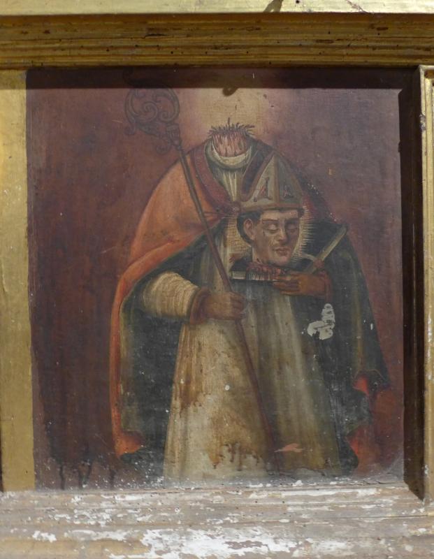 Sobre un fondo neutro se muestra, de manera frontal, el cuerpo de un obispo mártir decapitado (podría tratarse de san Dionisio de París). Viste túnica, sobrepelliz y capa pluvial prendida por un broche pectoral. Mana abundante sangre del cuello, y la cabeza radiada con la mitra episcopal se sitúa encima de un libro cerrado sostenido por la mano izquierda del mártir. Con la derecha sostiene el báculo. Ambas manos se cubren con guantes, propios de la dignidad episcopal, y en la derecha se aprecia en anillo, símbolo de su jurisdicción.