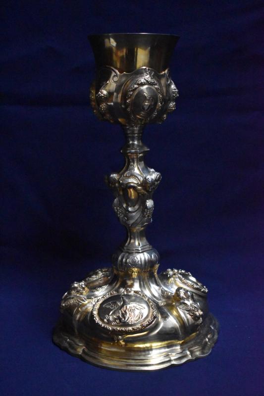 No es el primer cáliz de esta tipología que se cataloga en la basílica de la Encina, y como los anteriores este también salió de los talleres cordobeses del siglo XVIII. Destaca su depurada técnica y exuberancia decorativa. Todo él está concebido como un inmenso motivo ornamental, la estructura queda diluida tras el abundante repujado y cincelado que la encubre. No obstante, consta de basamento liso de perfil ondulado, traza que mantiene el cuerpo dispuesto sobre él. El astil queda reducido al nudo, que está flanqueado por leves molduras, aunque el nudo adopta una estructura troncopiramidal invertida. La copa adopta forma de campana, algo más de su altura total está cubierta de motivos repujados. La decoración general utiliza espejos ovales, motivos vegetales, ces arrocalladas y cabezas de querubes. En base, nudo y subcopa se crean una suerte de cartelas con los Arma Christi y Símbolos Eucarísticos