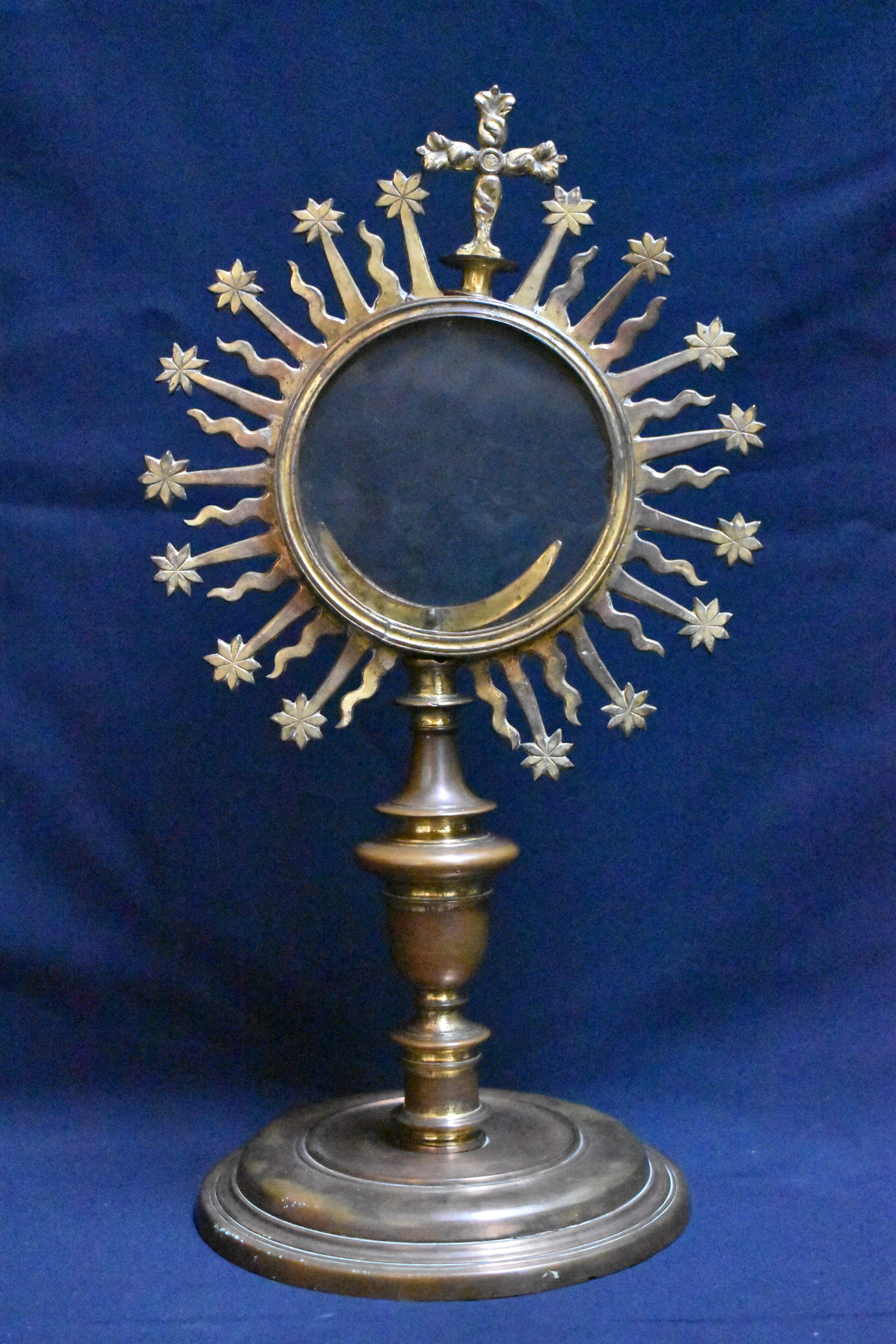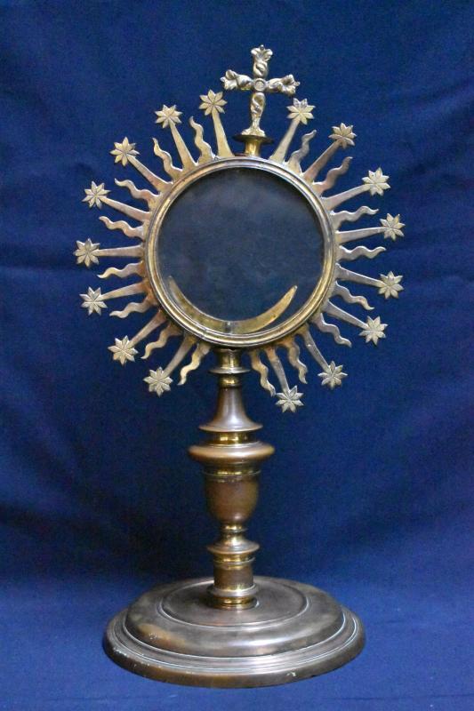 Custodia portátil o de tipo ostensorio compuesta a base de pie circular moldurado, gollete de tipo "carrete", astil abalaustrado con nudo periforme y ostensorio circular rodeado de rayos lisos rematados en estrellas y flameados que alternan. El conjunto remata en cruz latina de brazos bulbosos
