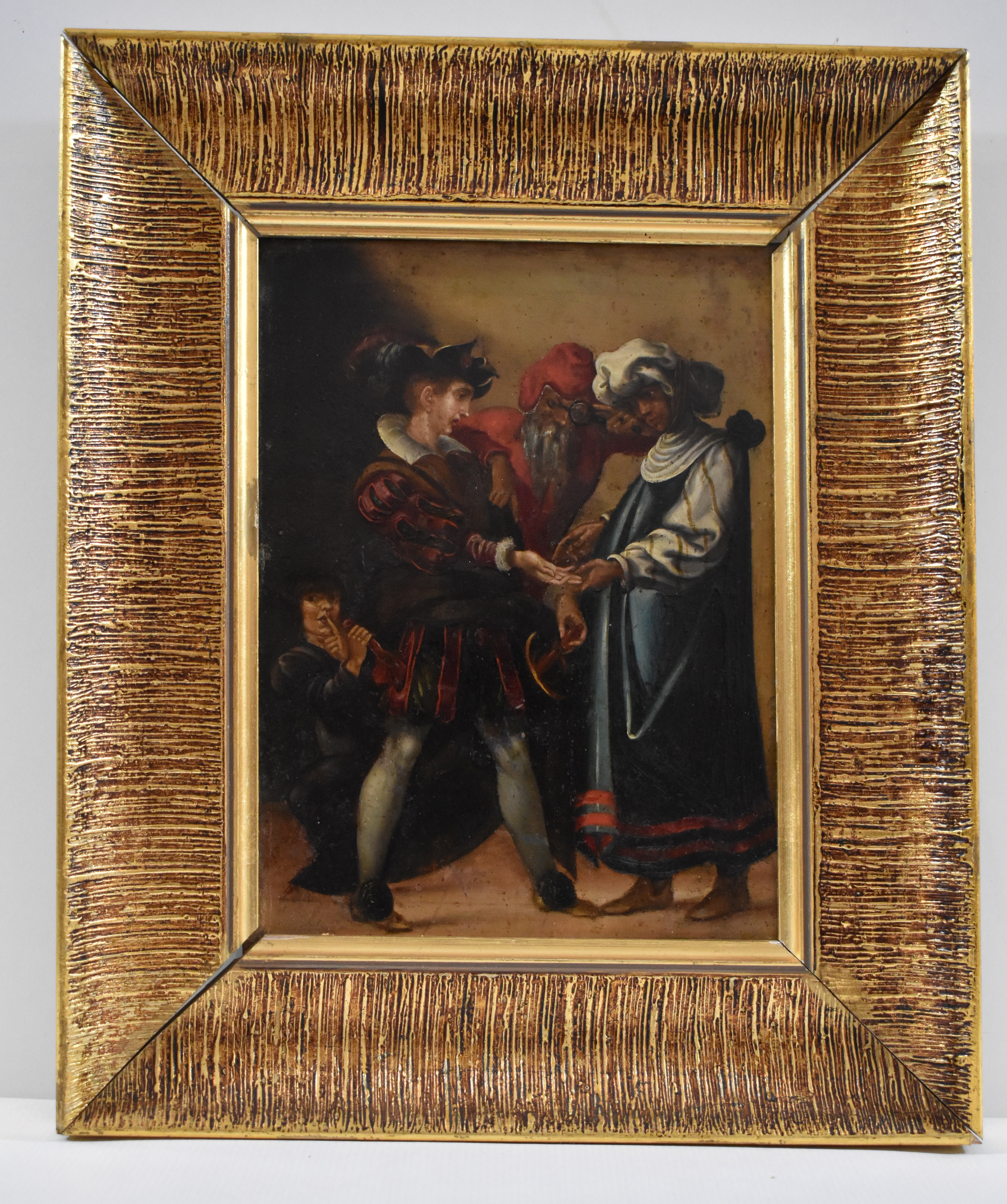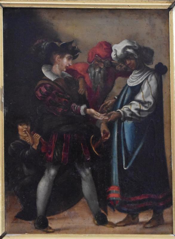Pequeño cuadro historicista que narra uno de los pasajes de la vida de José, en concreto su venta como esclavo por sus hermanos y la compra por Potifar, capitán de la guardia de Faraón. Los tres personajes en pie son los que se ocupan de la transacción mientras José aparece en un segundo plano, en cuclillas sustrayendo algo del pantalón de uno de sus hermanos y llevándose la mano izquierda a la boca para reclamar el silencio del espectador. Es un cuadro sencillo, ajeno a las preocupaciones perspectívicas y espaciales y centrado en los personajes y sus ricos atuendos.