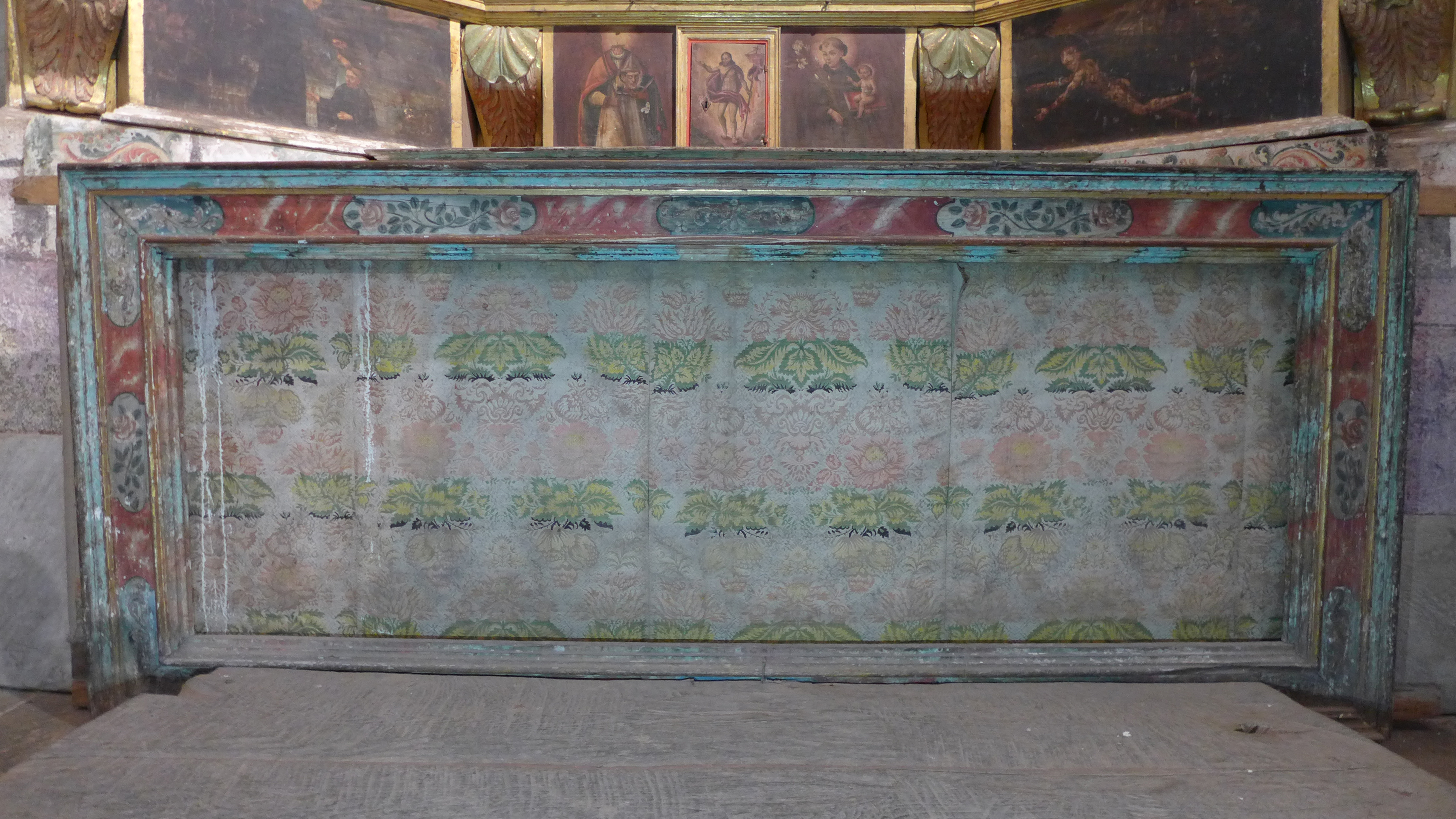 Marco de madera, cuyo listón inferior queda oculto por la grada previa. Está policromado en su frente sobre fondo rojo marmoleado, con adornos florales alternos insertos en molduras pintadas de fondos blancos y azules.