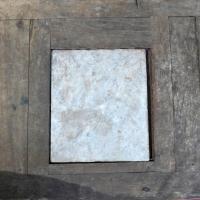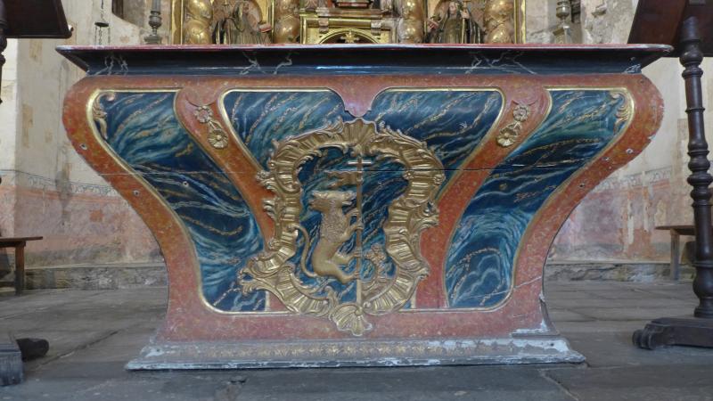 Mesa de perfil curvilíneo dividida en su frente en tres partes por medio de dos molduras paralelas al perfil. Sus fondos azules están jaspeados, y las molduras doradas y policromadas en rojo. En el centro de la mesa campea un gran escudo dorado con el emblema del monasterio en medio de marco de cornucopia. Los laterales tan solo se decoran con policromía, reproduciendo nuevamente jaspeados e imitando con pintura la continuación de las molduras del frente.