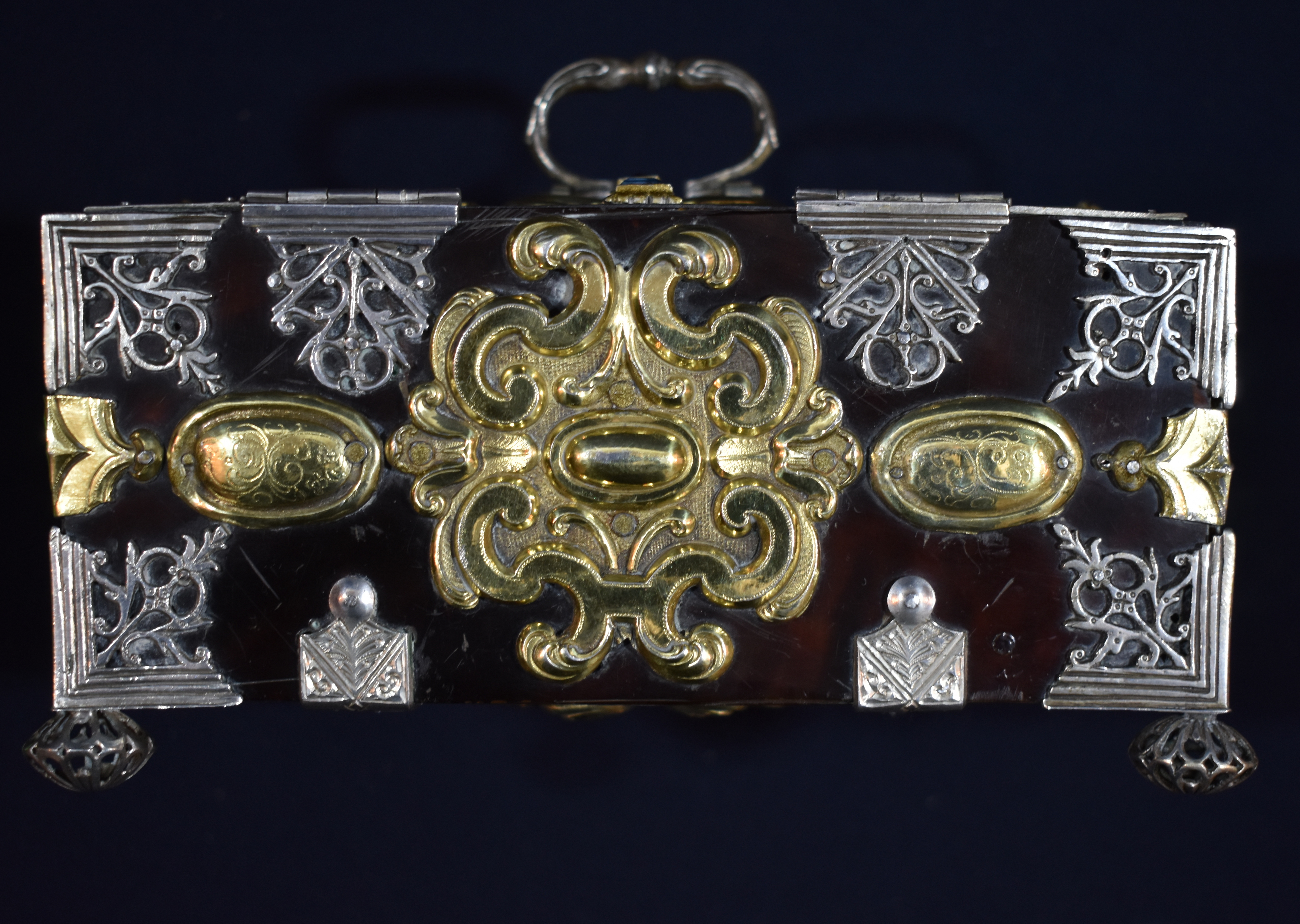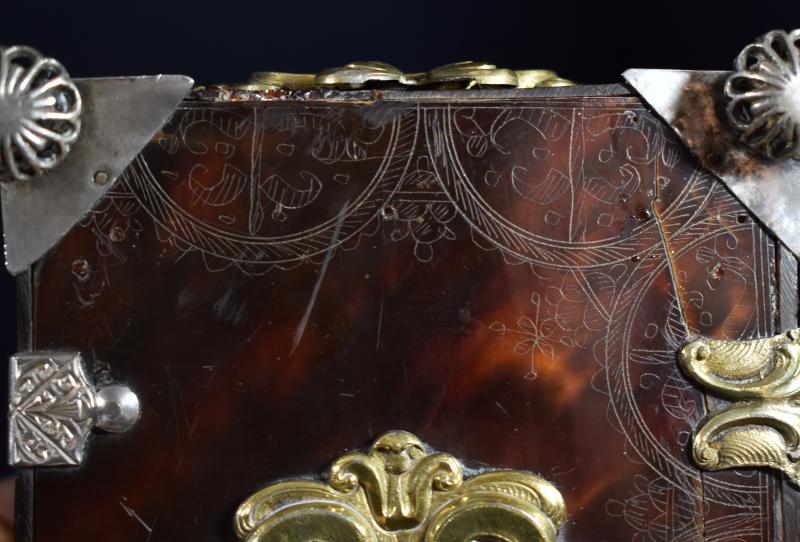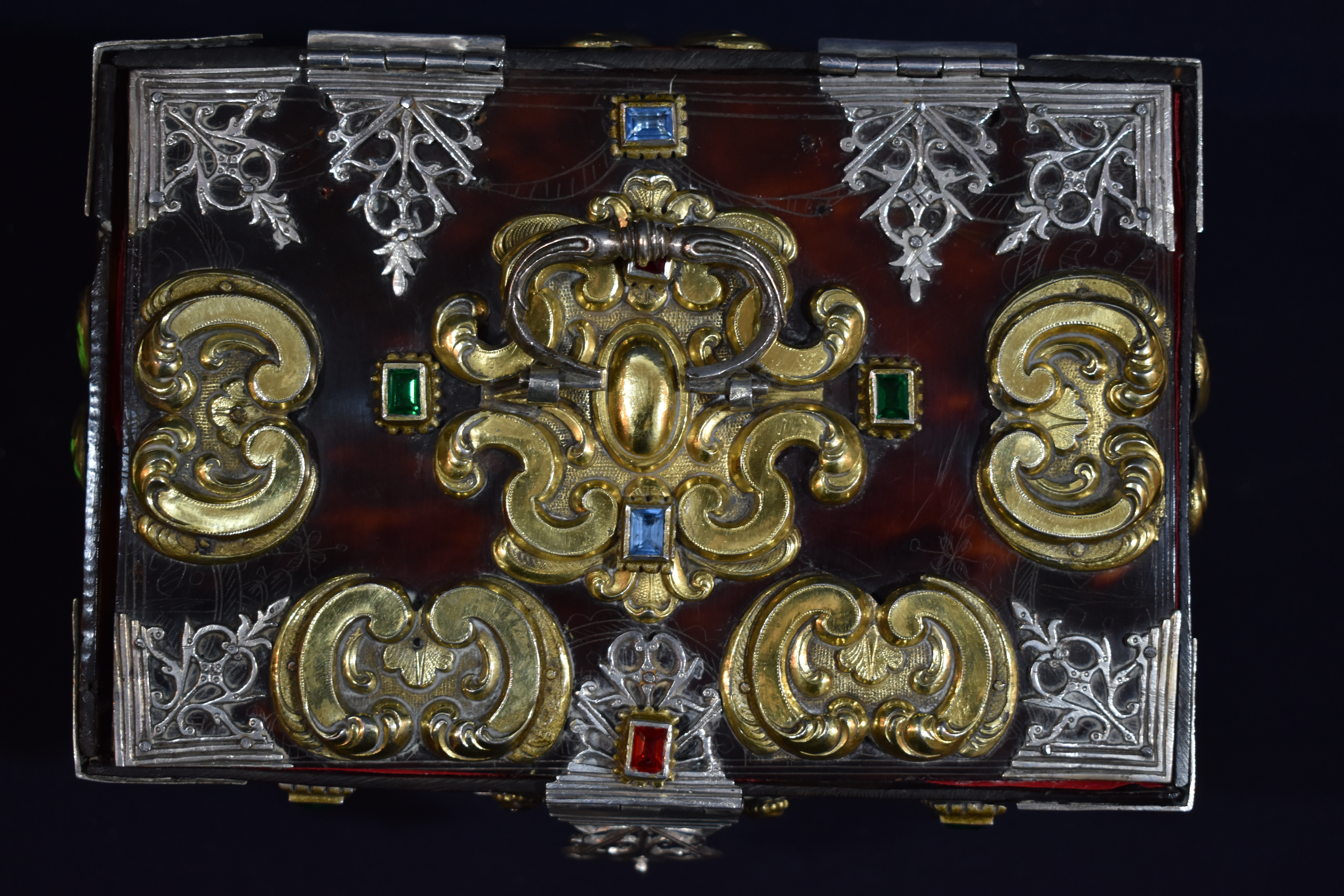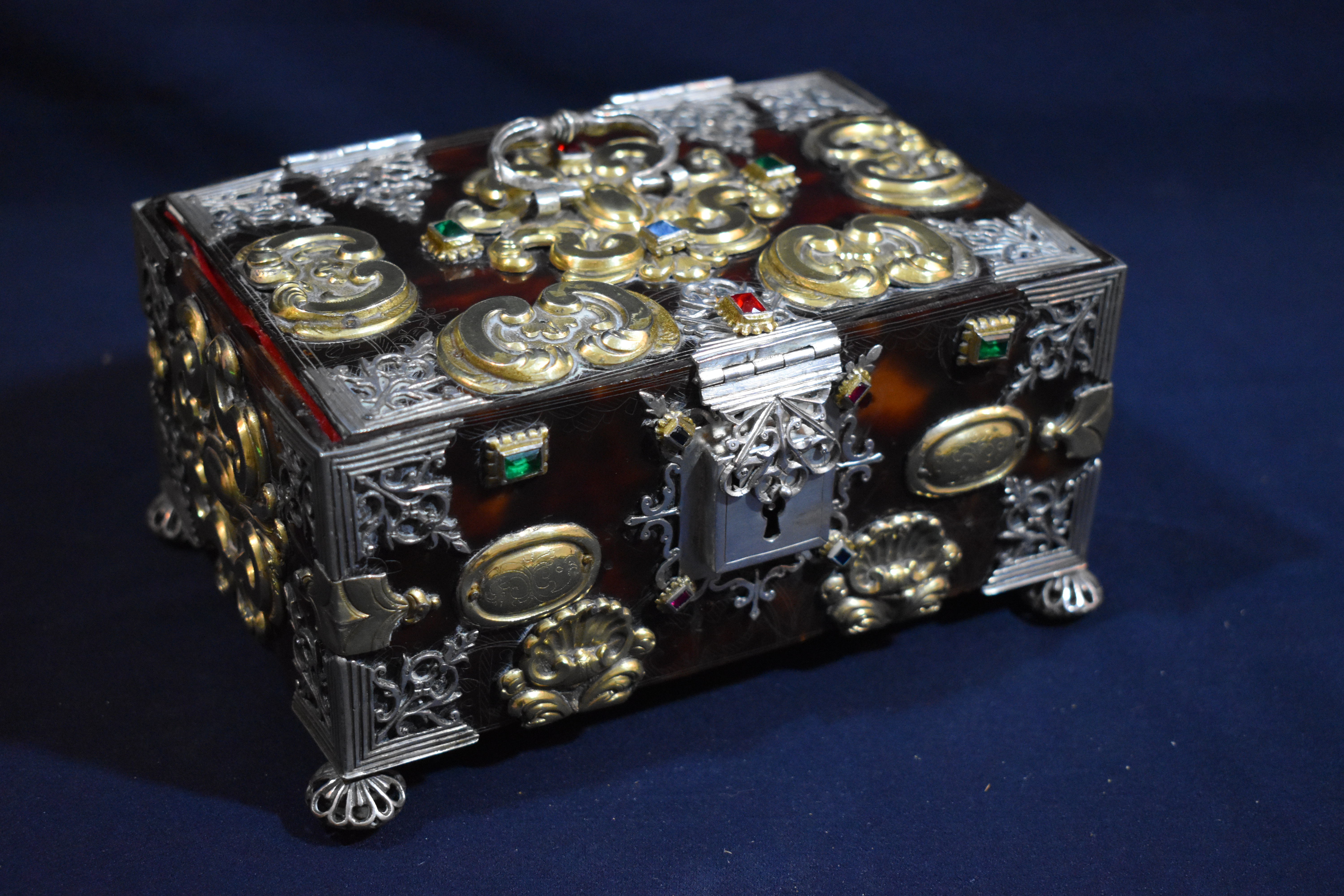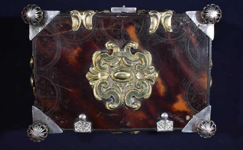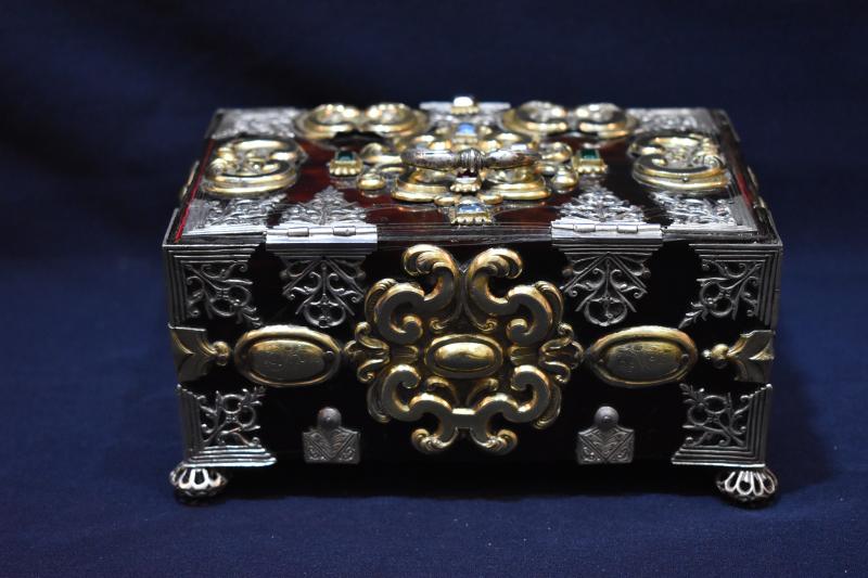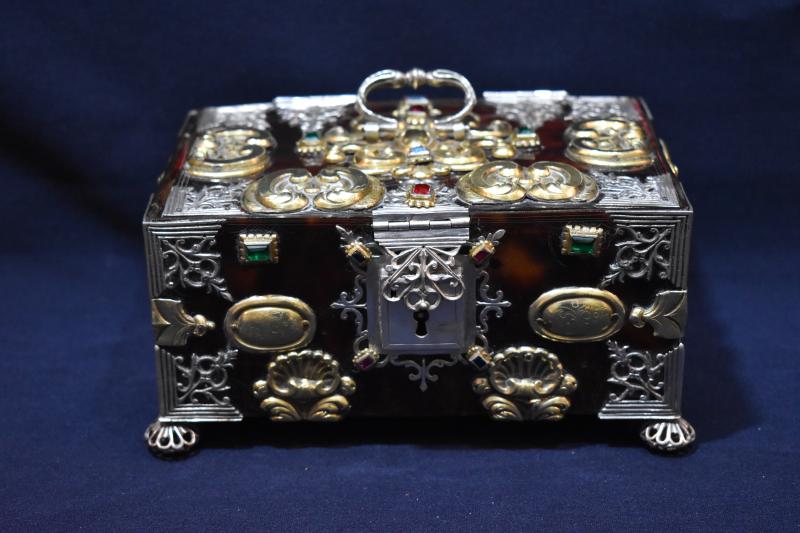 Caja rectangular de madera chapeada en carey o concha reforzada y adornada con múltiples apliques de plata en su color y dorado, además de engastes de pedrería. Se ha planteado su origen americano (quizá mejicano o peruano), por lo que quizá su presencia aquí se deba a su donación por parte de algún devoto indiano. Cada una de sus caras va chapada en carey y muestra todo tipo de apliques: espejos ovales, conchas, cantoneras caladas, ces arriñonadas, tornapuntas...). Pero, además, en la propia concha se aprecia una delicada labor de grabado reproduciendo motivos barrocos. Todo el conjunto se aposenta sobre cuatro patas globulares caladas, similares a botones. Conserva cerraja de plata en el frente y va forrada en su interior con terciopelo rojo.