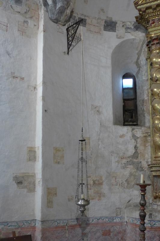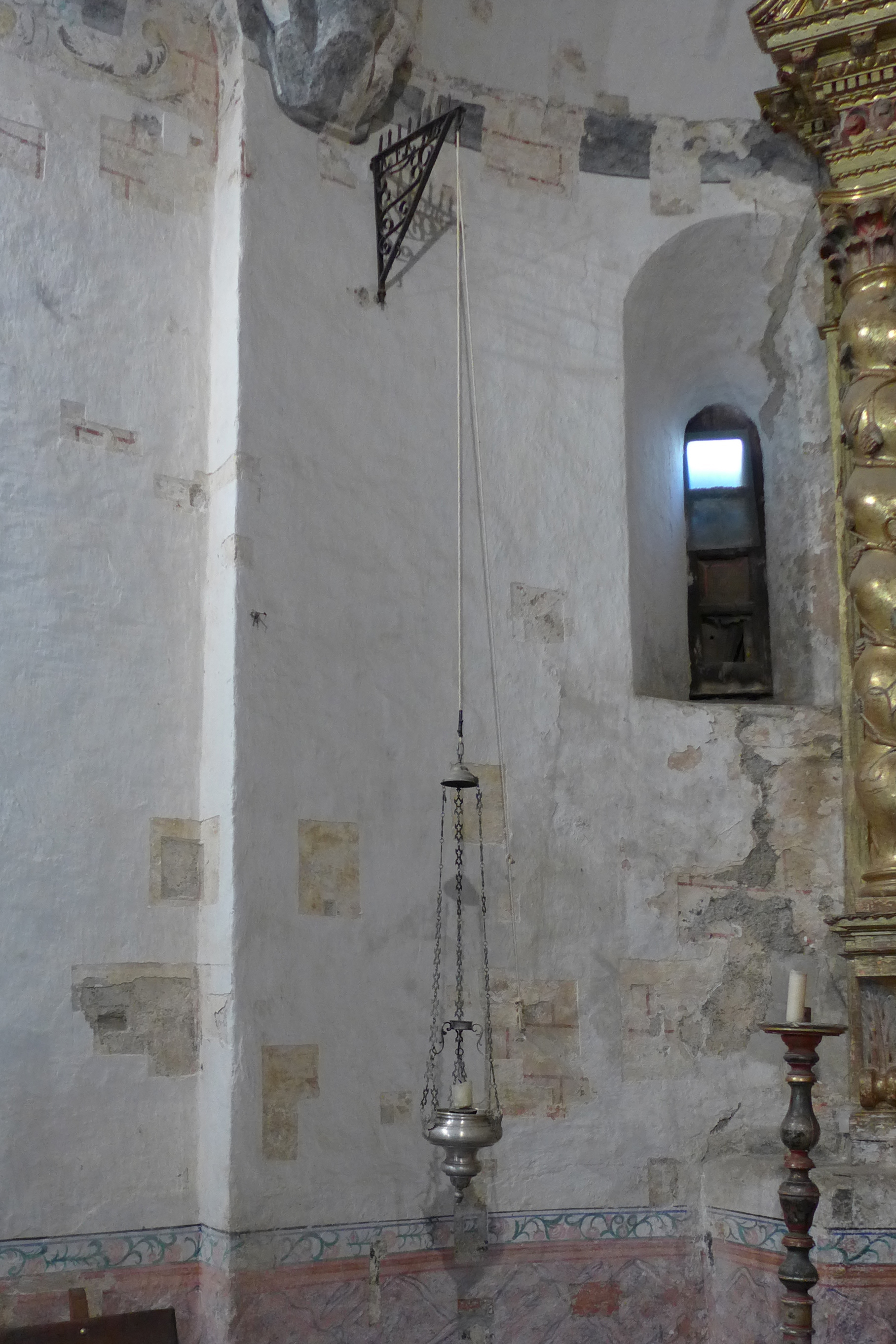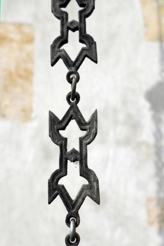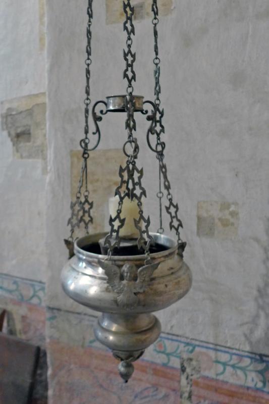 Presenta dos partes: superior, donde se encuentra la sujeción y la parte inferior (el vaso). Ambas partes se sujetan por tres largas cadenas de eslabones. La iluminación se conseguía mediante un cirio inserto en un aro circular sostenido por apliques que arrancan de las cadenas. Sorprende el tipo de eslabón utilizado en las cadenas, una pieza alargada, simétrica, rematada con cada lado por tres picos, más desarrollado el central (del que arranca la argolla para encadenarse con el siguiente), con un remache en el centro del eslabón.