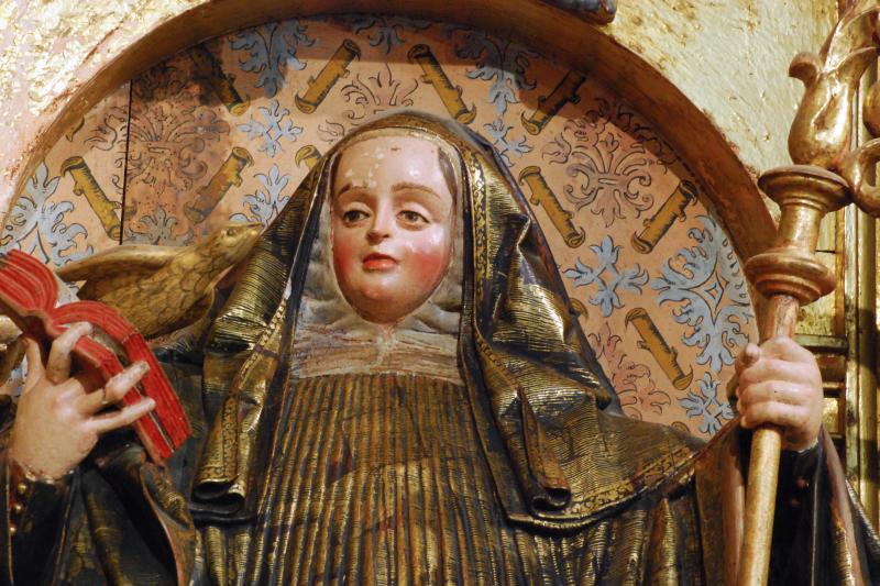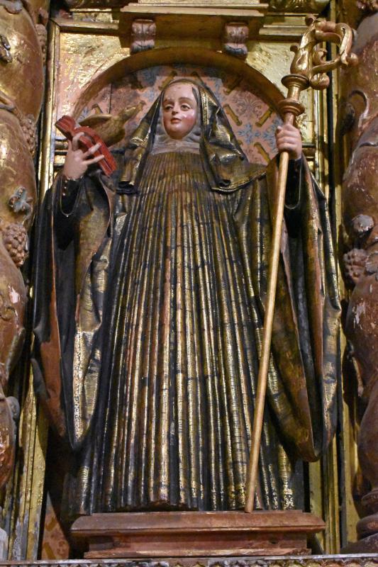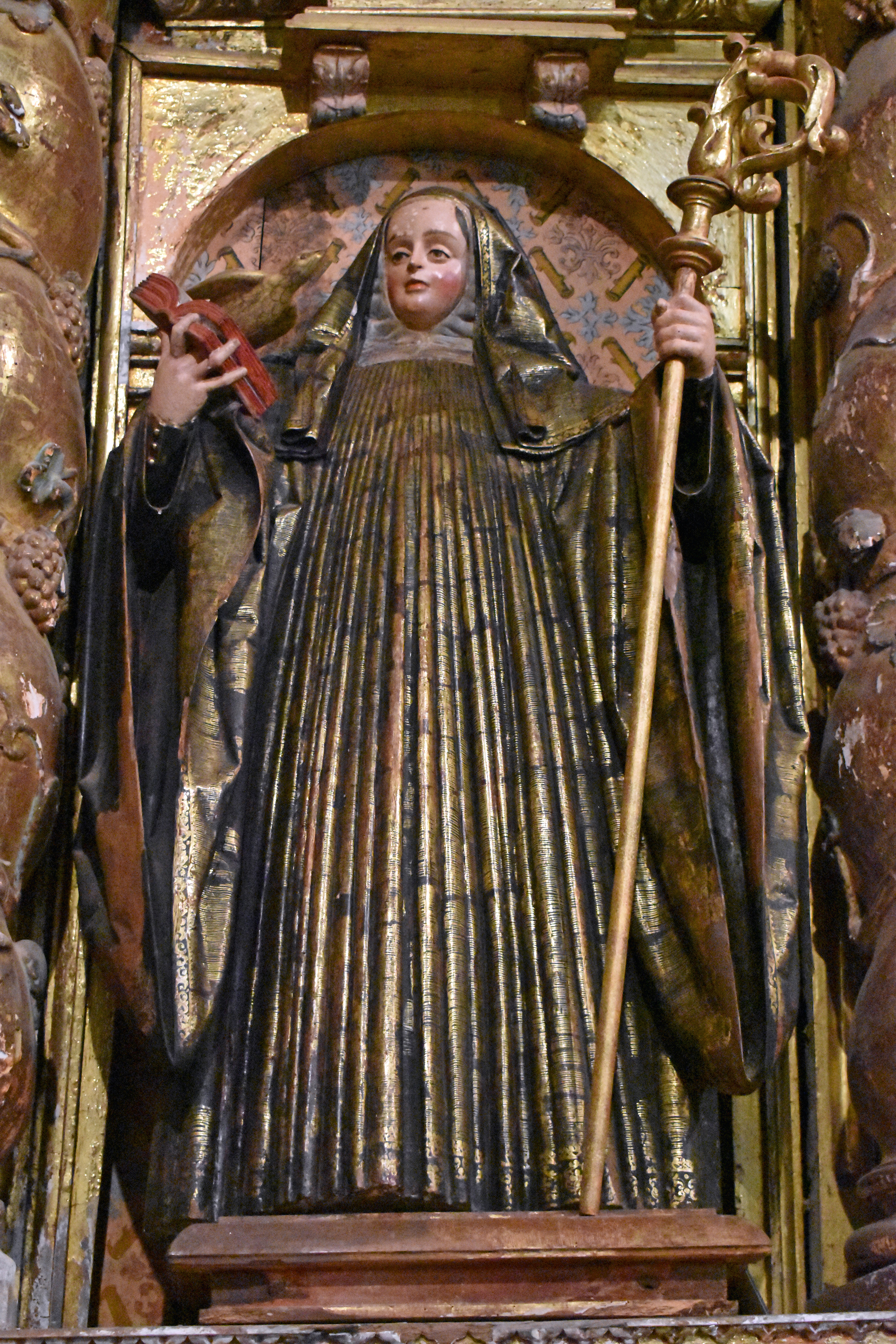 Se representa de pie a la hermana de san Benito, en composición casi cónica por el tratamiento de su rotunda cogulla estofada, con ubicuos pliegues paralelos y dos enormes mangas. La santa, tocada, sostiene un libro abierto en su mano derecha (la Regula Sancti Benedicti), con la paloma del Espíritu Santo sobre él. Con los dedos aparenta insertos entre sus páginas aparenta señalar un pasaje interesante de la Regla. La mano izquierda, por su parte, sostiene un báculo abacial. La peana en la que se asienta es una pieza exenta.