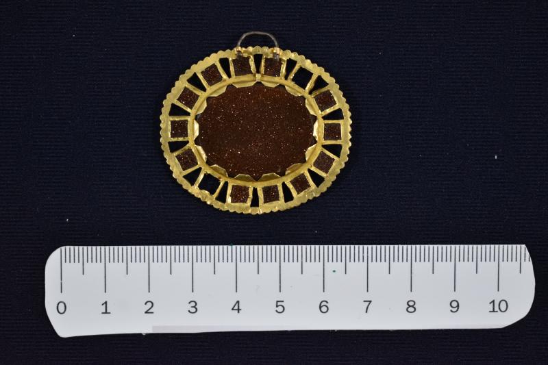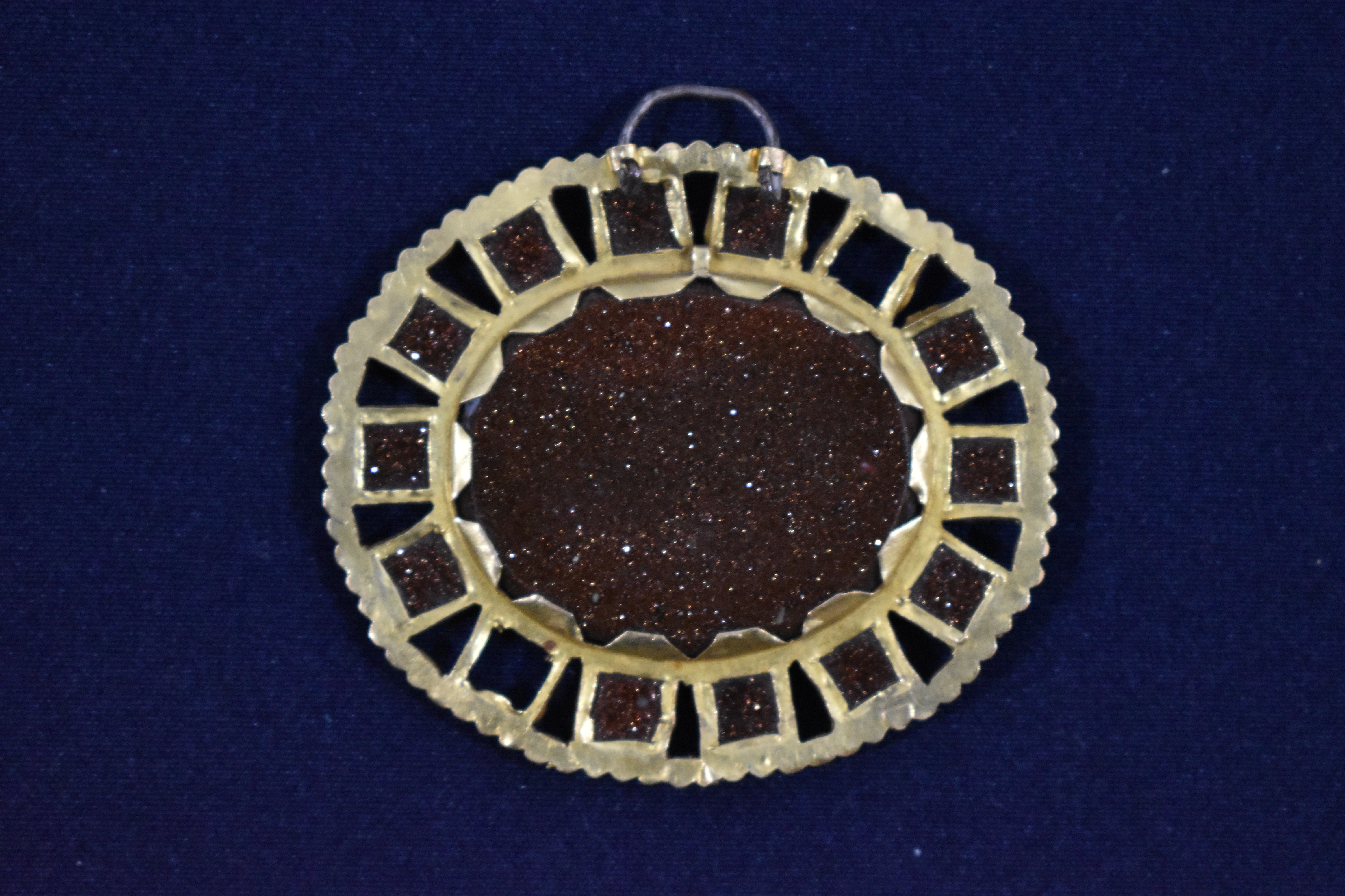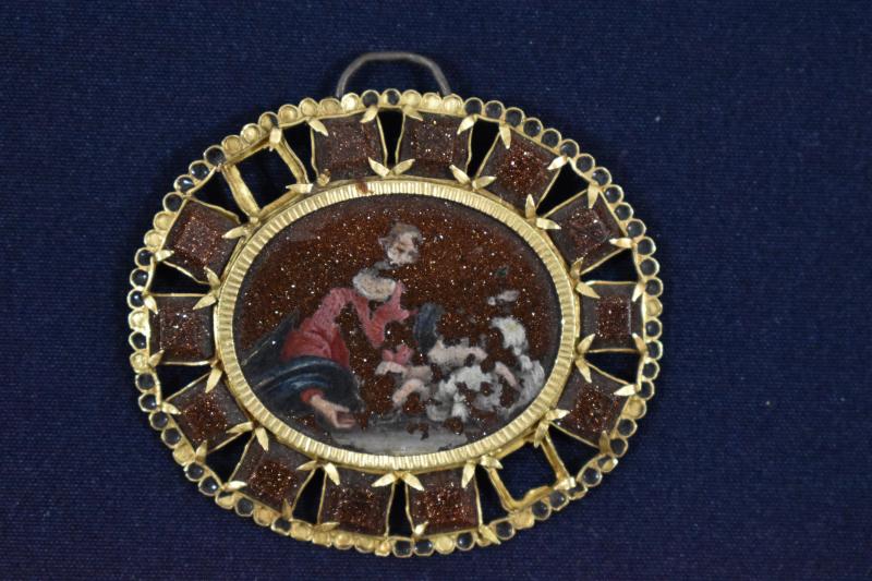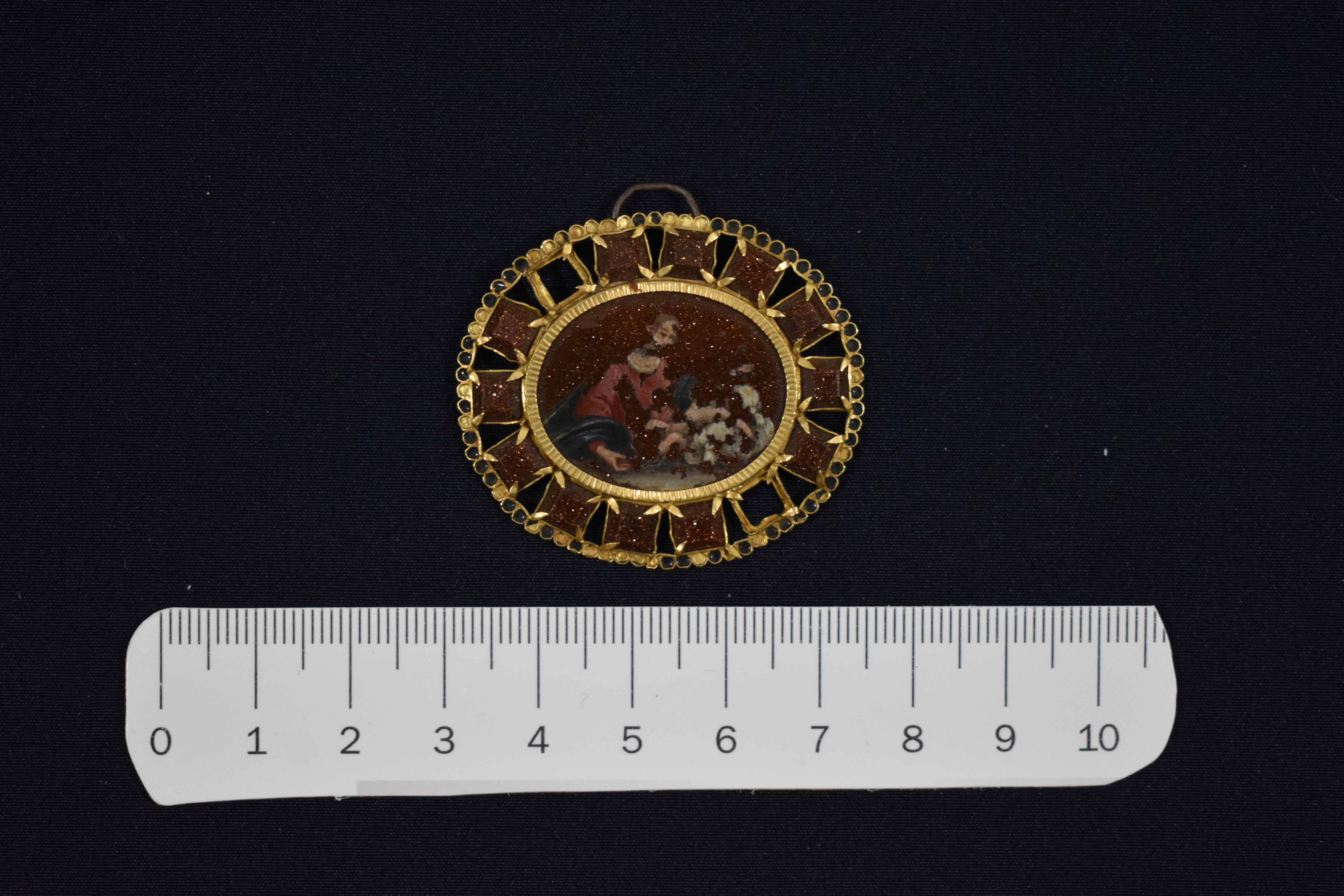 Broche ovalado de oro con base de piedra preciosa y una representación pintada de una dama en un jardín