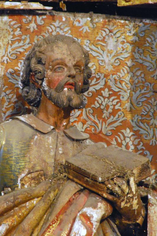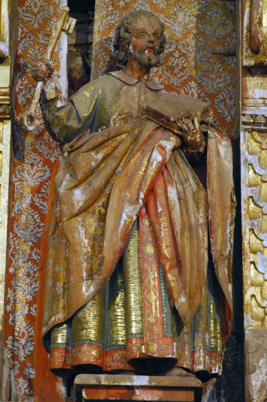 Figura de pie, en posición frontal, que representa a un personaje de cabellera larga, frente despejada y barba. Porta un libro abierto en su mano izquierda, situada a la altura del pecho, y una enorme llave en la derecha, que la tiene levantada y se protege con un guante, símbolo episcopal. Destaca su atuendo estofado compuesto de camisa abotonada con solapas y lo que parece un enorme manto, recogido en varias vueltas, que otorgan una sensación de volumen a la figura en su parte inferior.