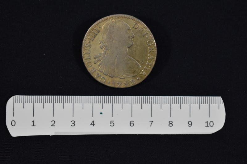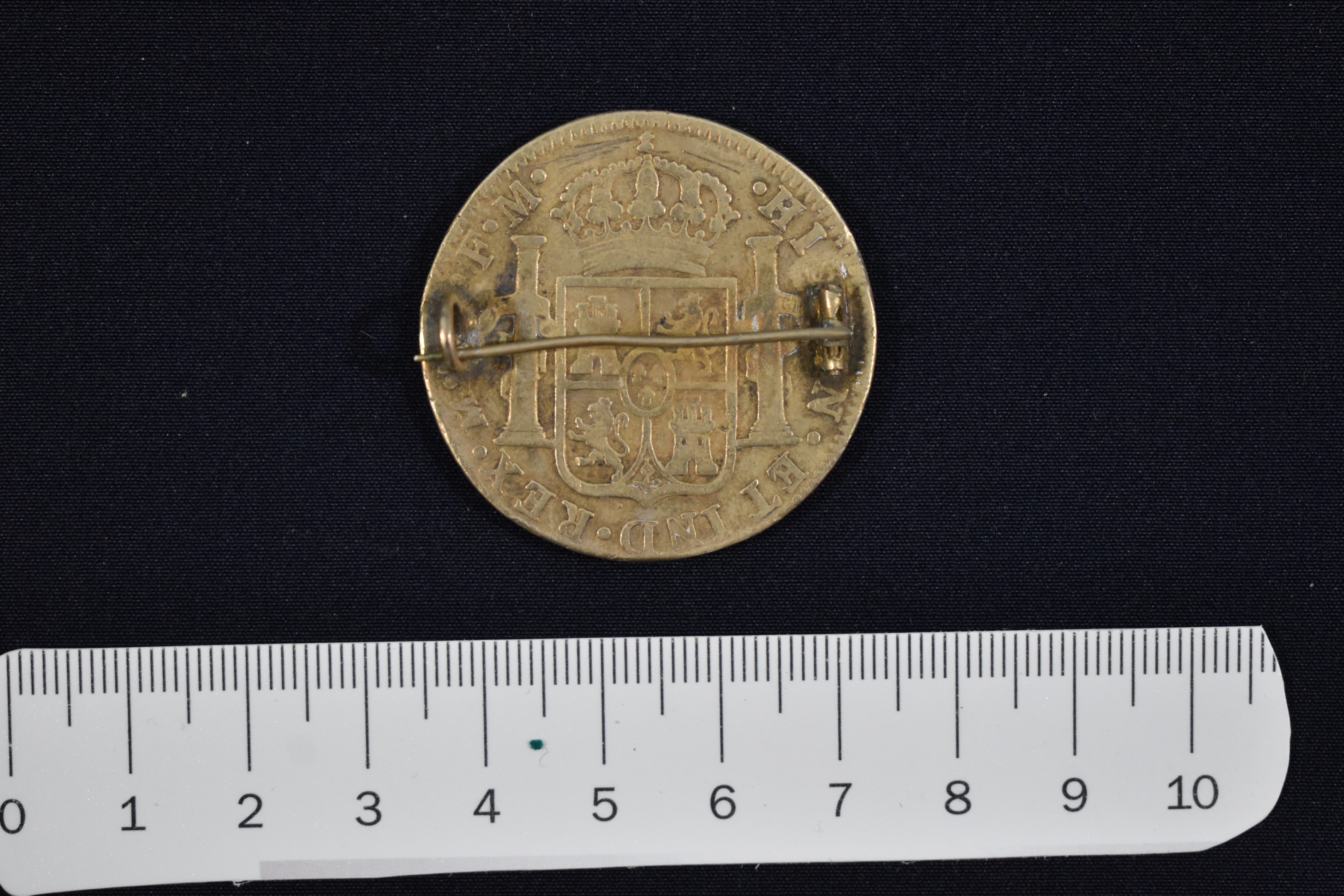 Moneda de 4 reales acuñada en 1792, con la efigie de Carlos IV en el anverso y el broche añadido por el reverso