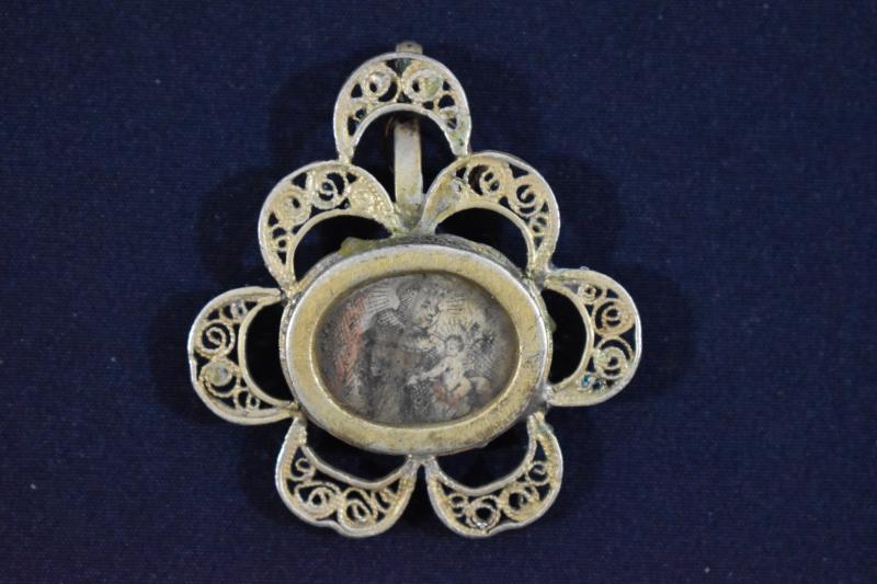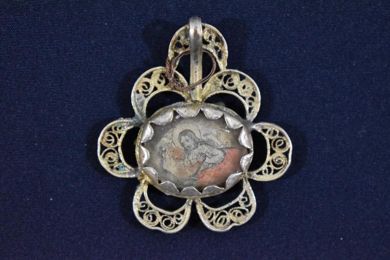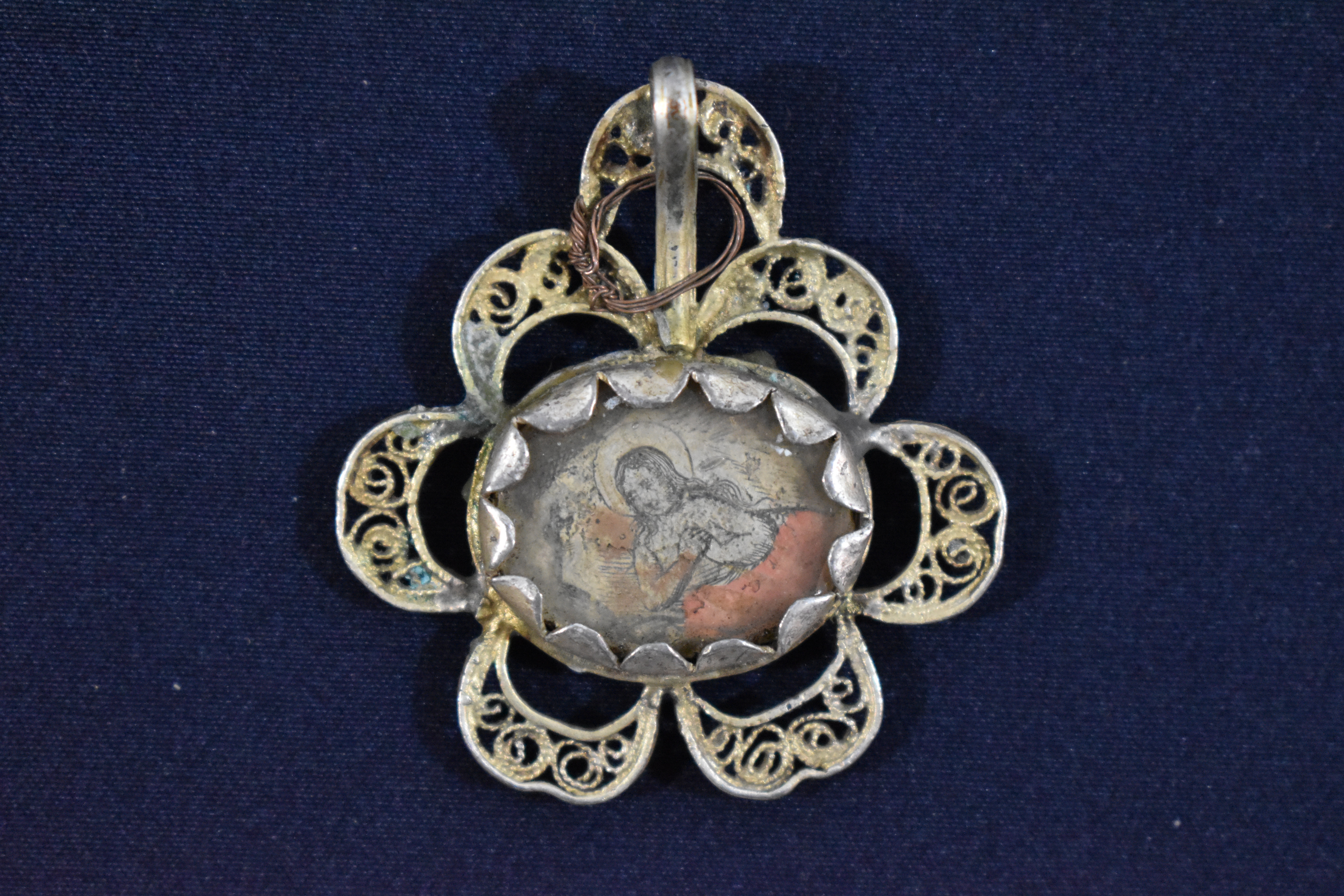 Joyel de plata afiligranada que muestra en su parte central un papel impreso coloreado con San Antonio de Padua en media figura con el Niño en el anverso y la Natividad en el reverso