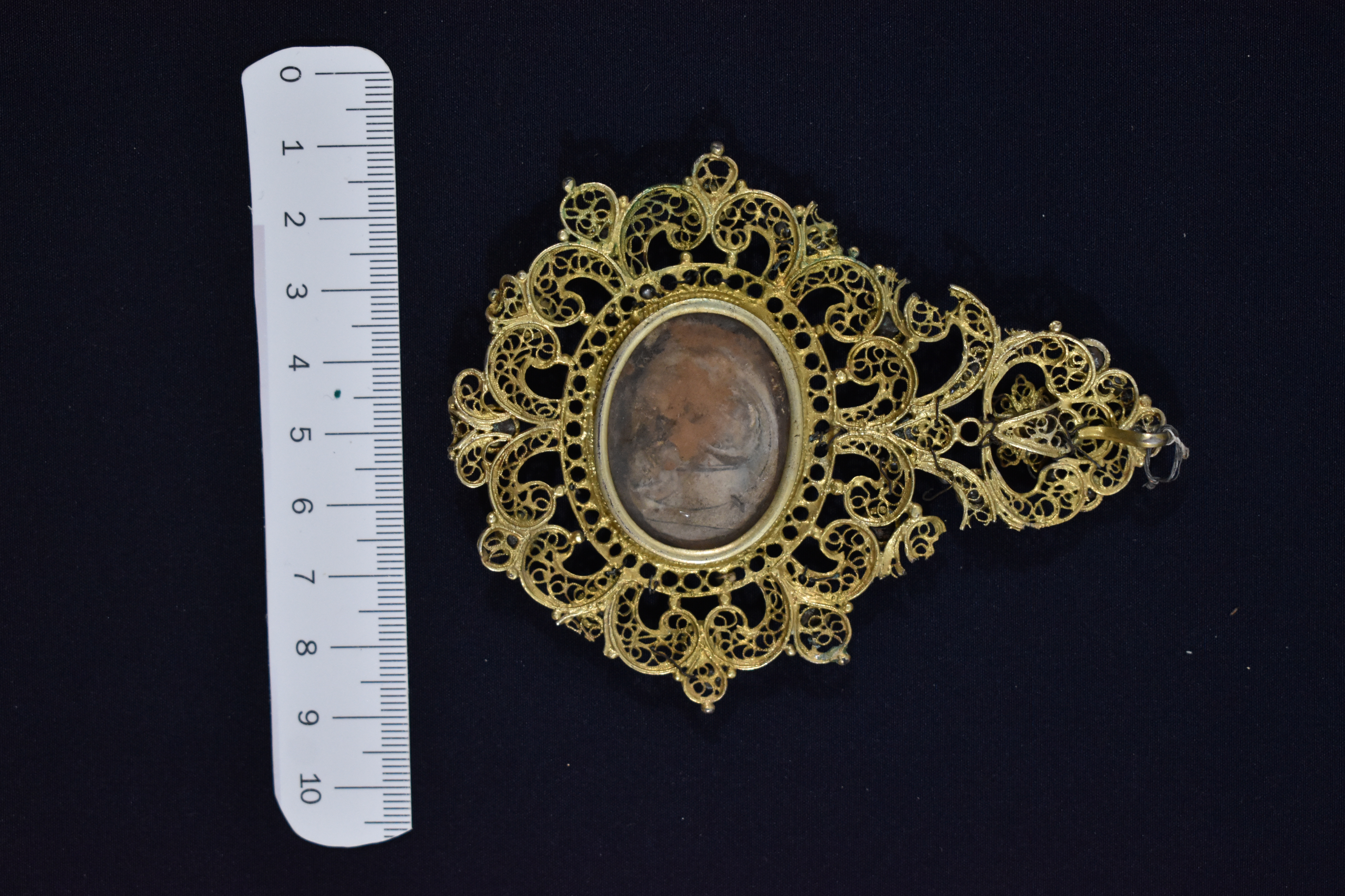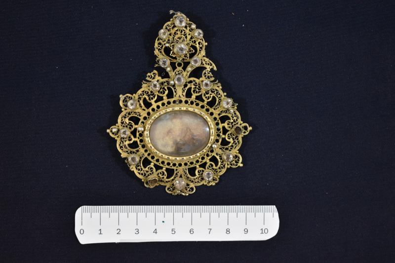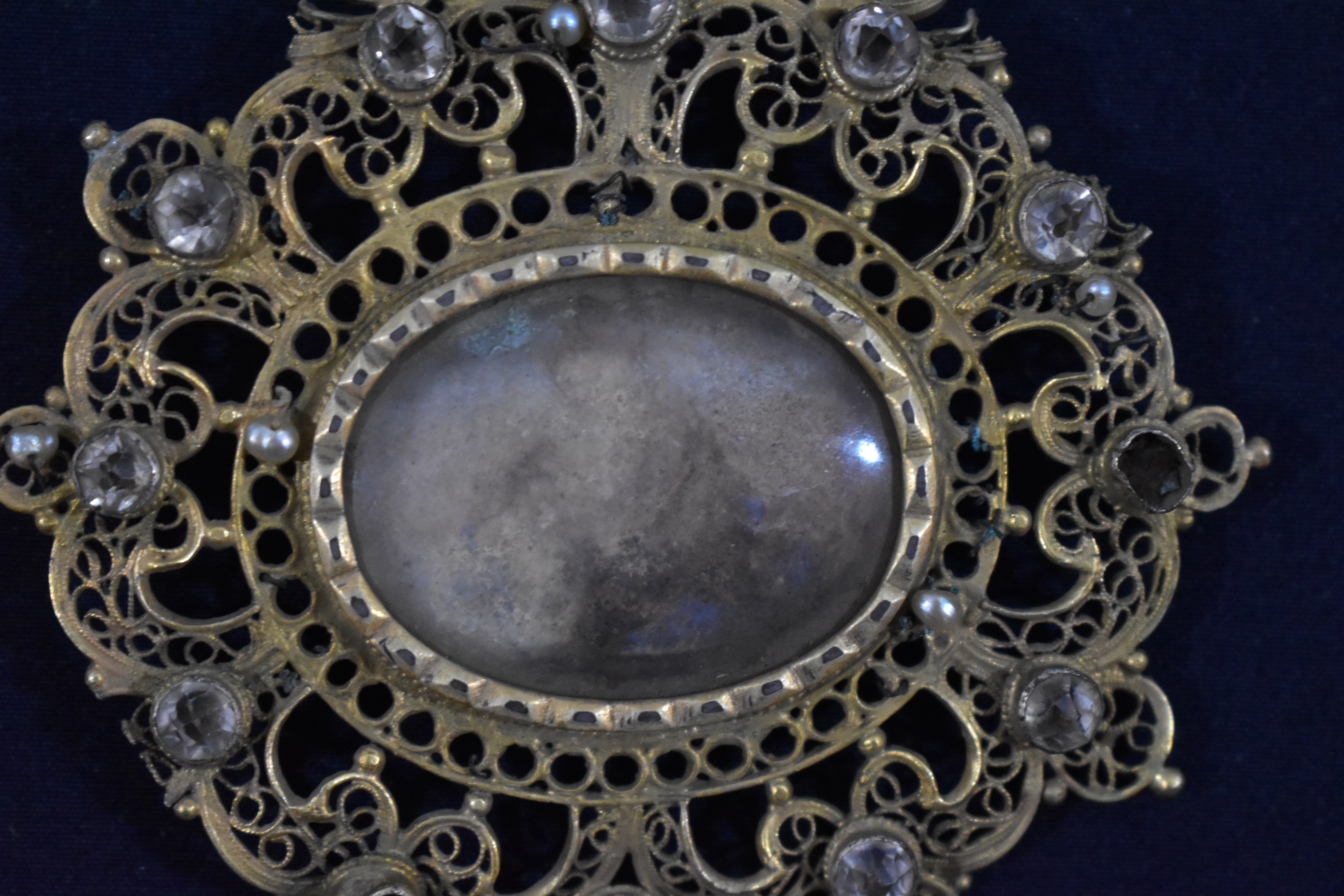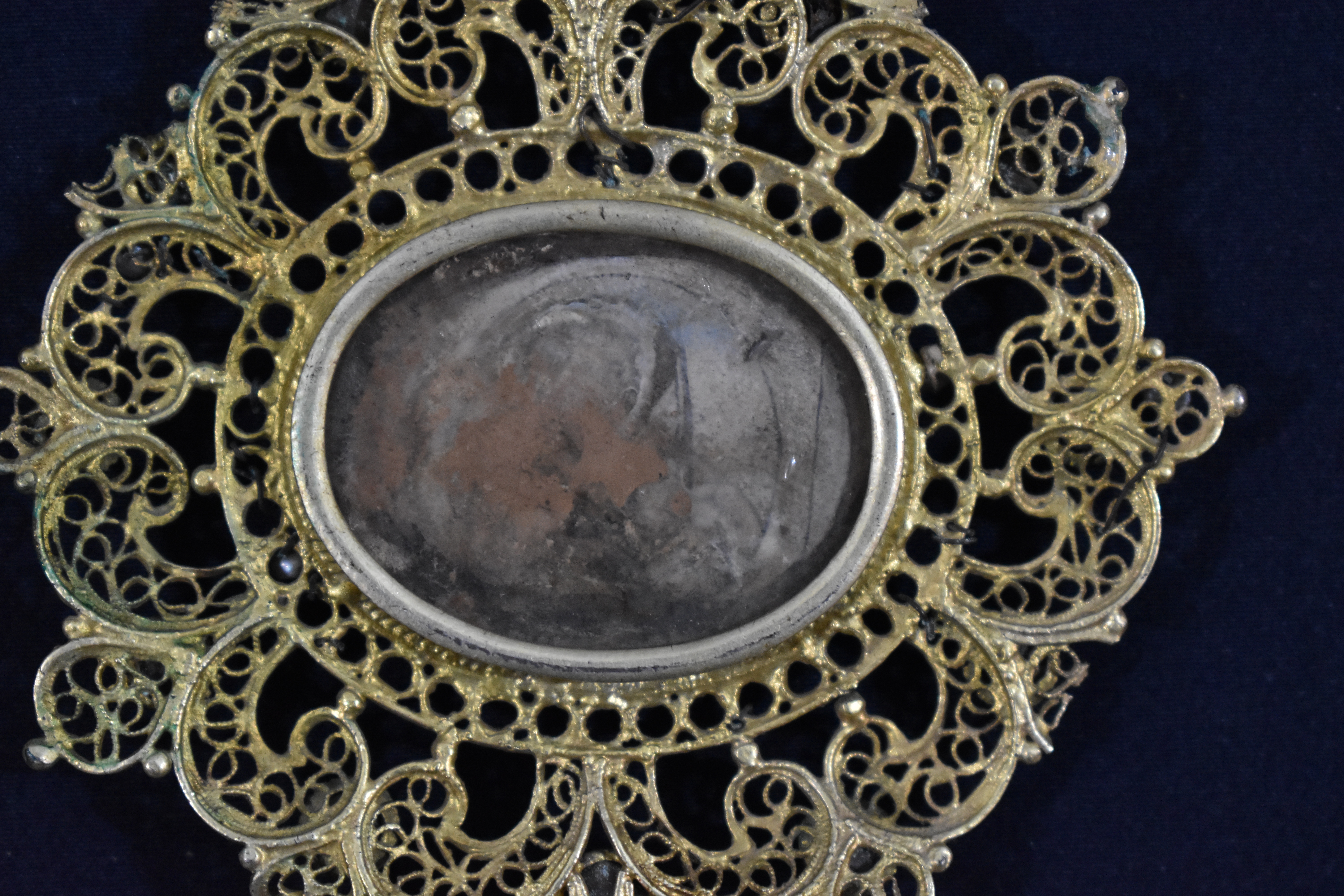 Joyel de plata dorada afiligranada con un óvalo en su centro donde se ve, en un fragmento de grabado coloreado a mano, en el anverso una posible Virgen con Niño, y en el reverso la escena se muestra irreconocible en lo que parece un fondo naturalístico