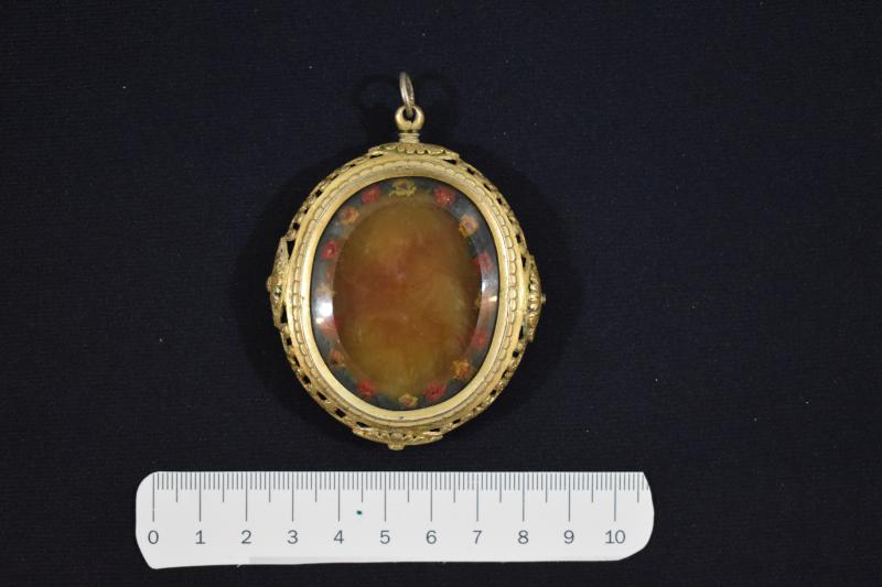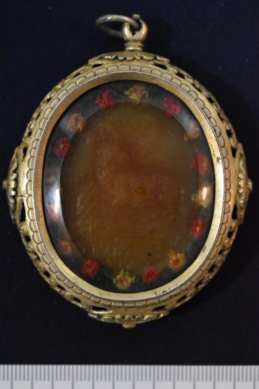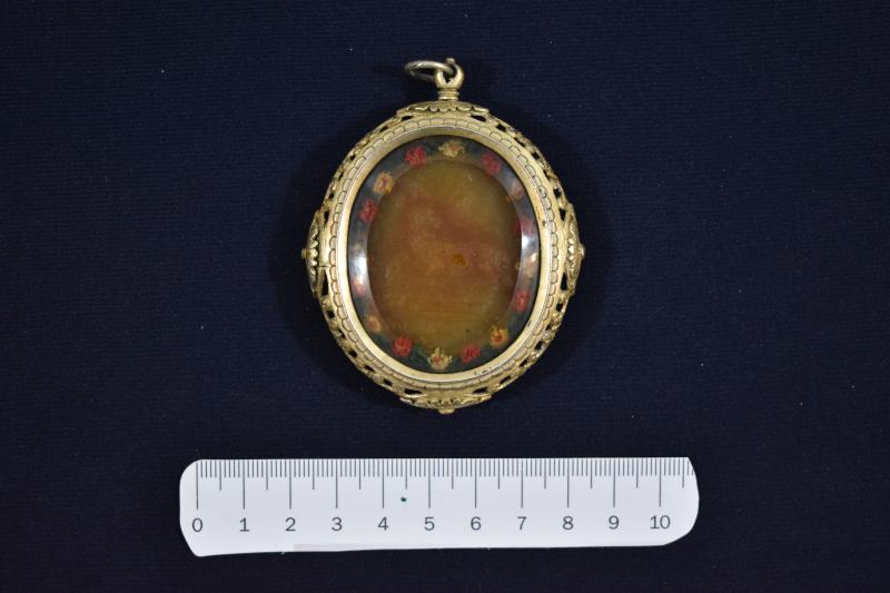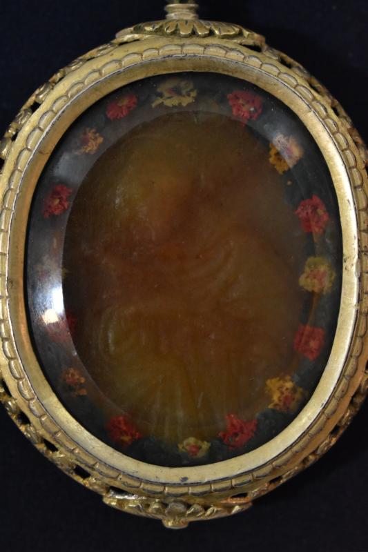 Medalla de plata dorada con un vidrio que protege una lámina de cera donde se imprimió el relieve de un Agnus Dei en el anverso, y de San Jerónimo penitente en el reverso