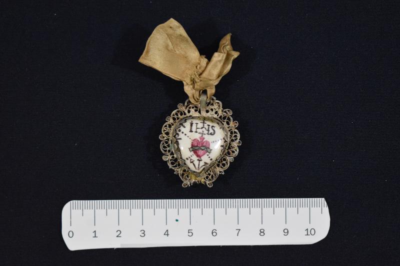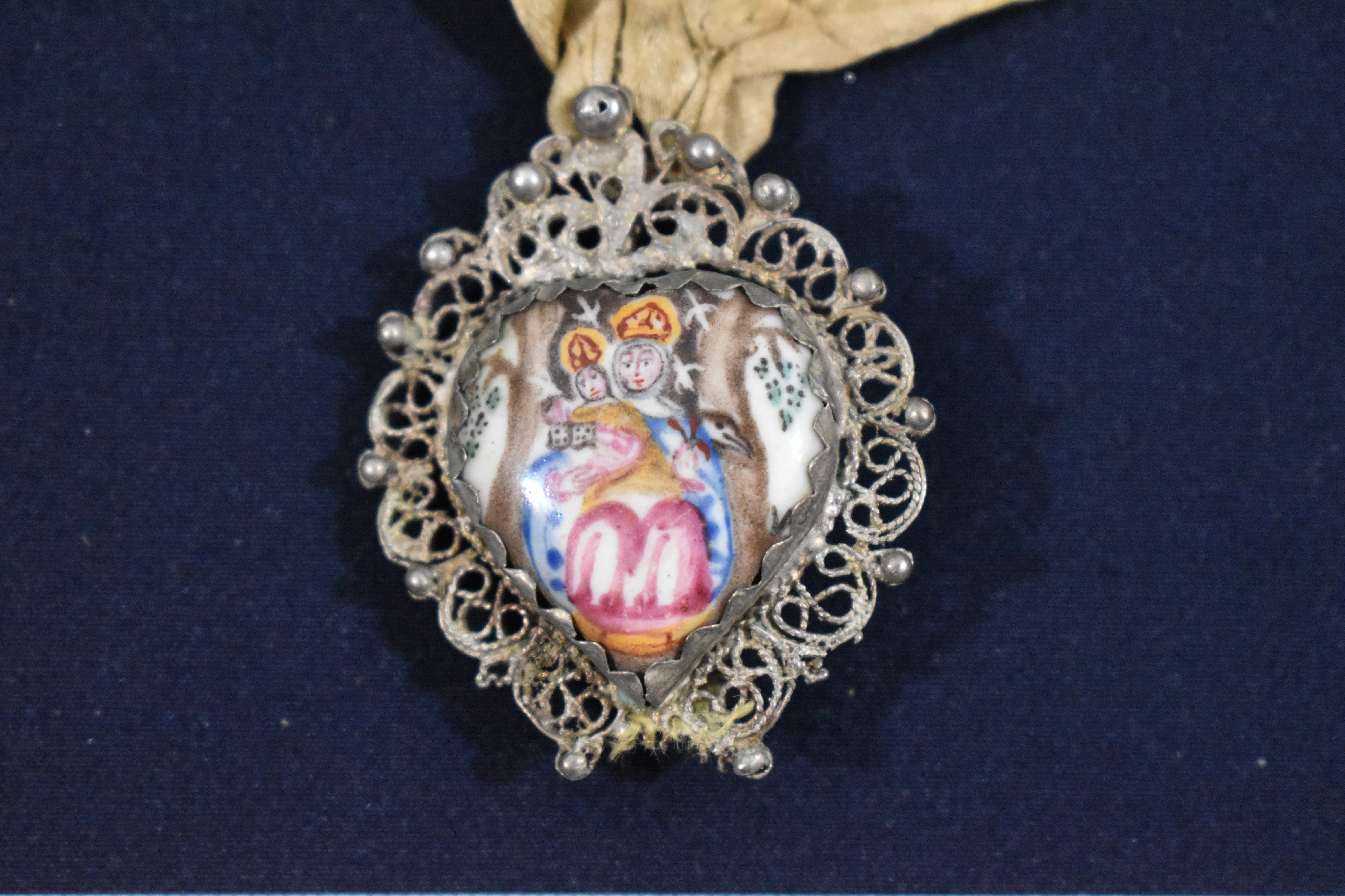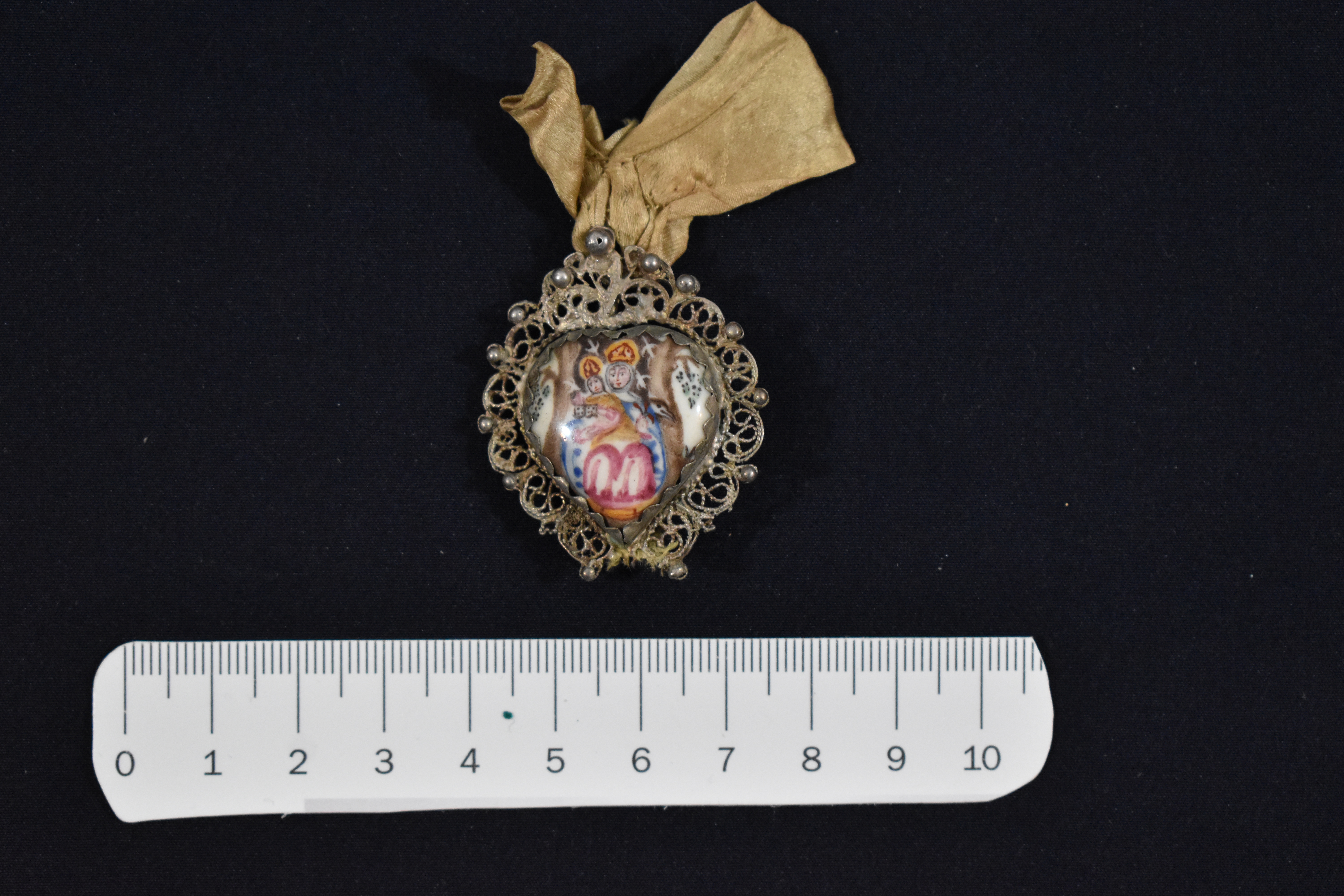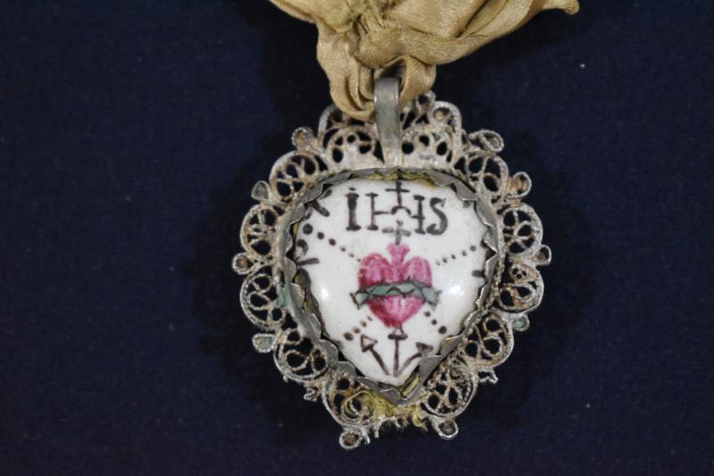 Insignia en forma de corazón enmarcada en filigrana de plata que contiene una pieza de cerámica vidriada policromada. En el anverso, un corazón junto al monograma IHS y tres clavos. En el reverso, Virgen con el Niño que sostiene un escapulario