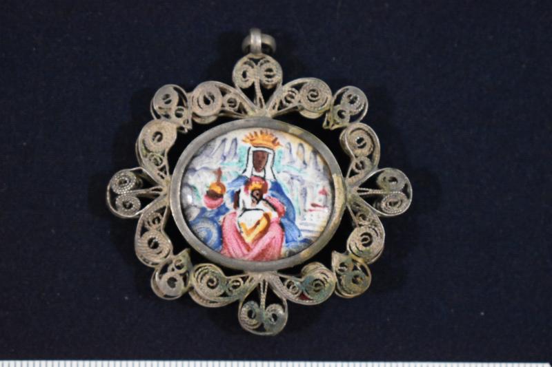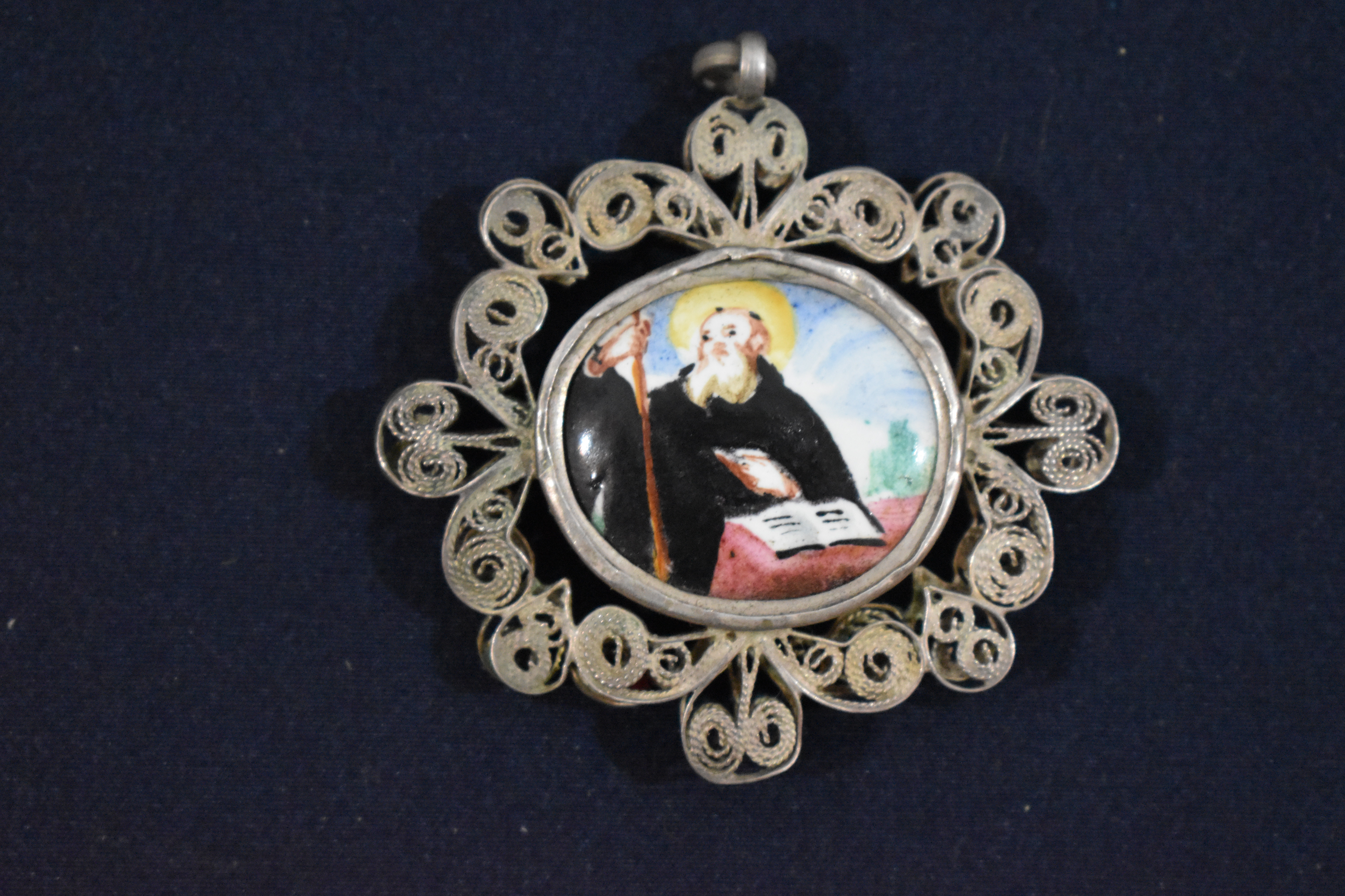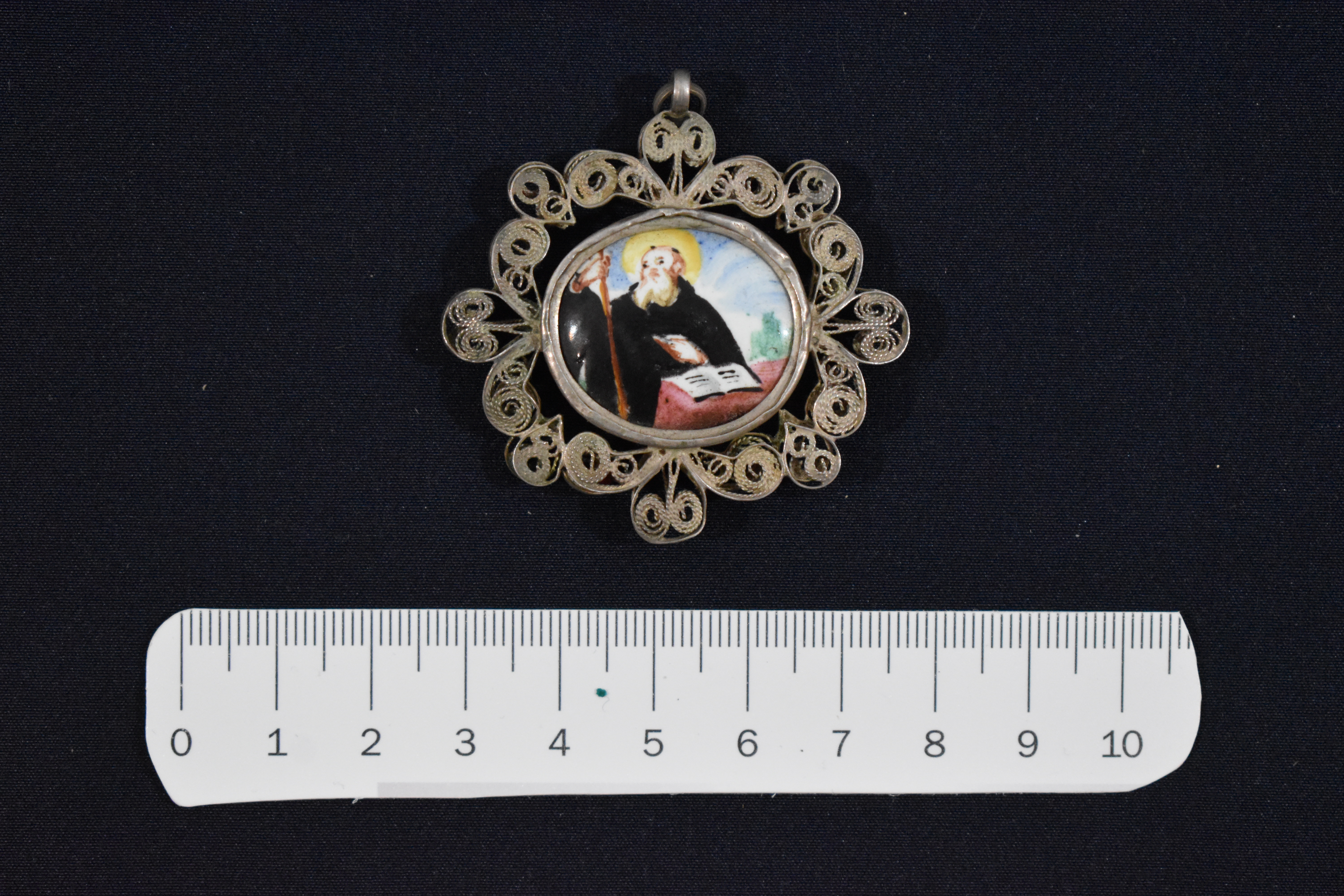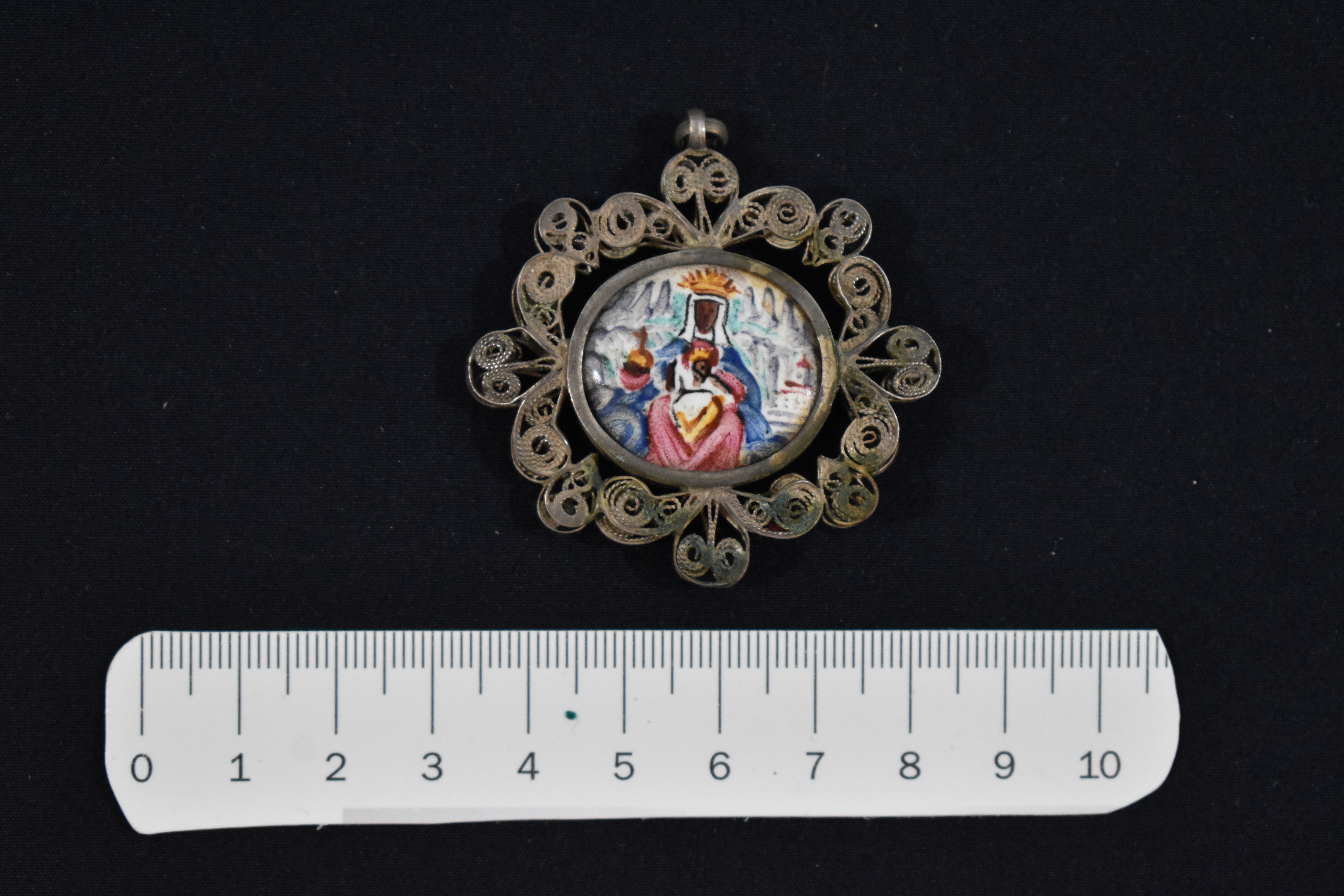 Joyel ovalado enmarcado en filigrana de plata que muestra una pieza de cerámica vidriada policromada. En el anverso, un benedictino (¿San Benito?). En el reverso, una Virgen negra con Niño, que pudiera ser la de Montserrat por el paisaje con picudas montañas que se ve al fondo