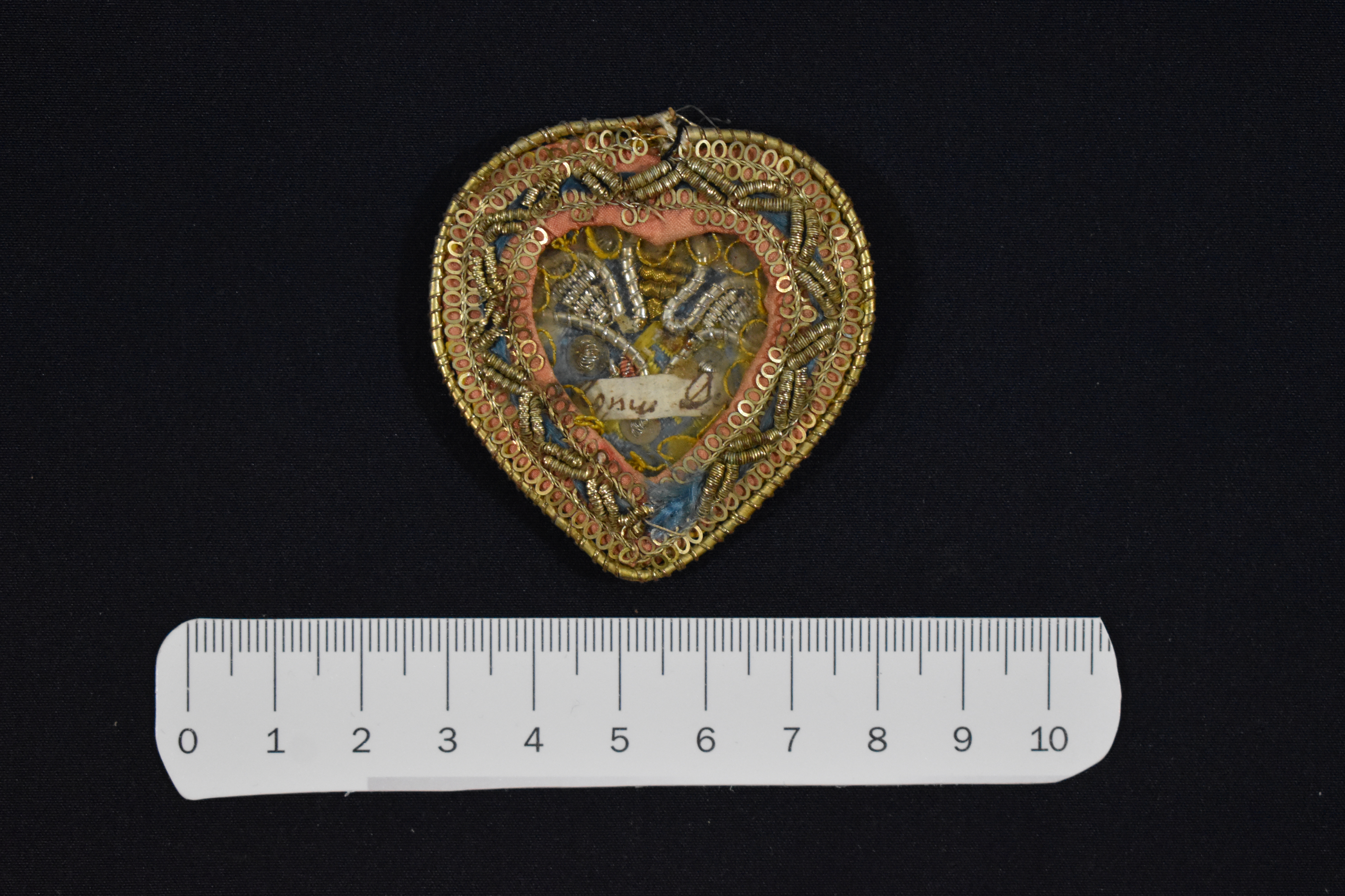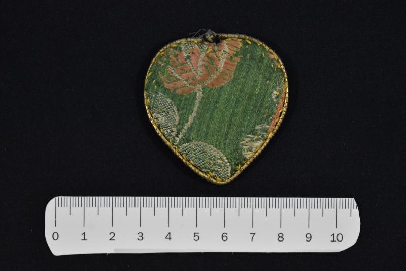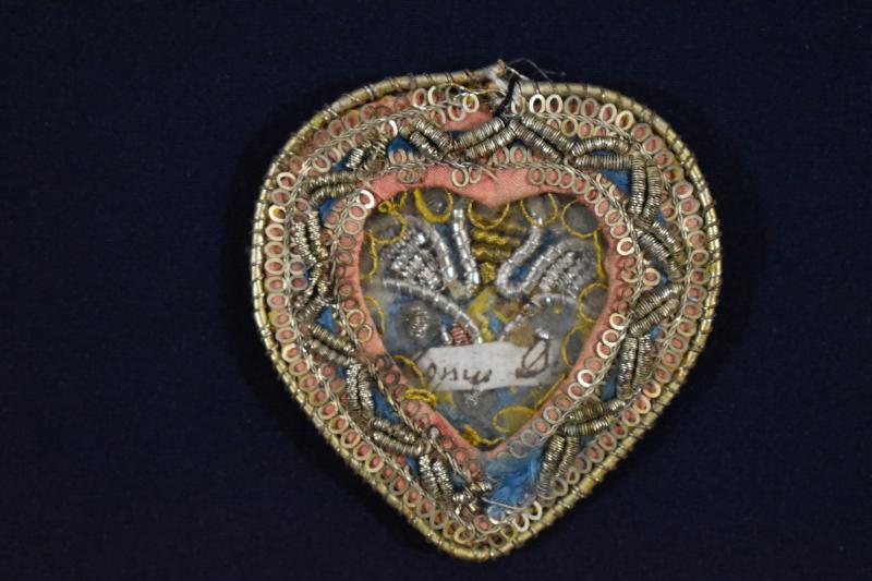 Relicario textil en forma de corazón cuajada de filigrana de plata (lo que en el argot se conoce como "labor de monjas"). Tiene auténtica en su interior que identifica la reliquia como del Agnus Dei