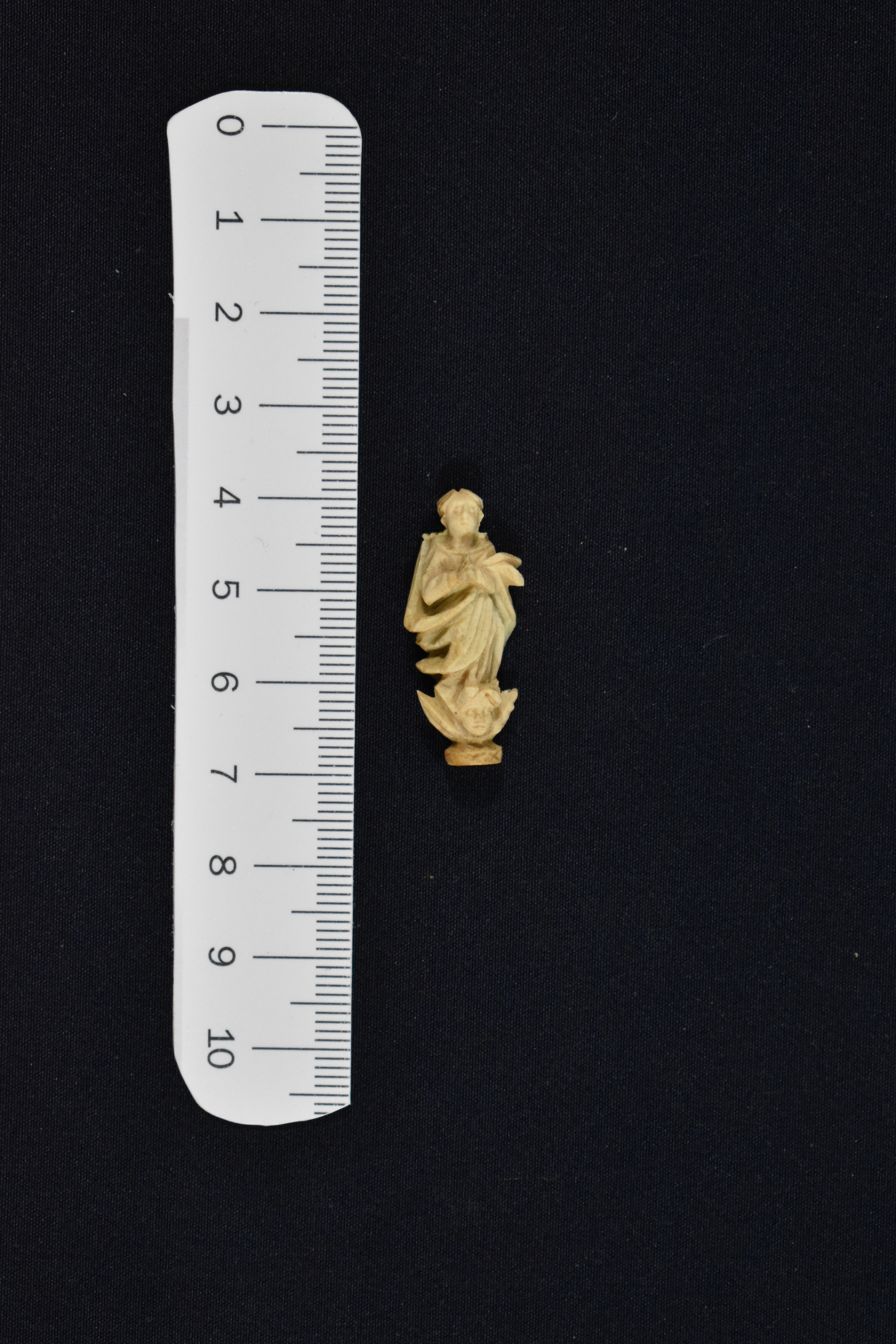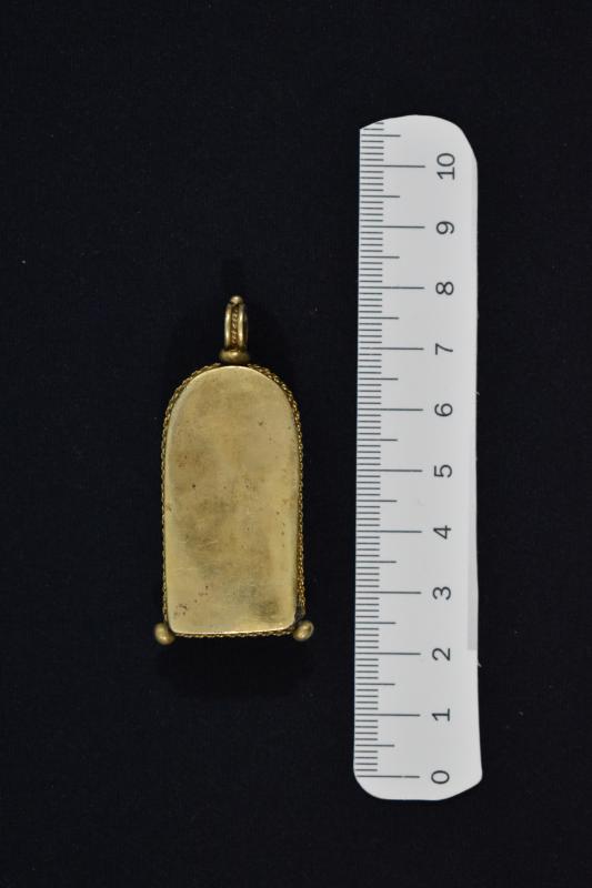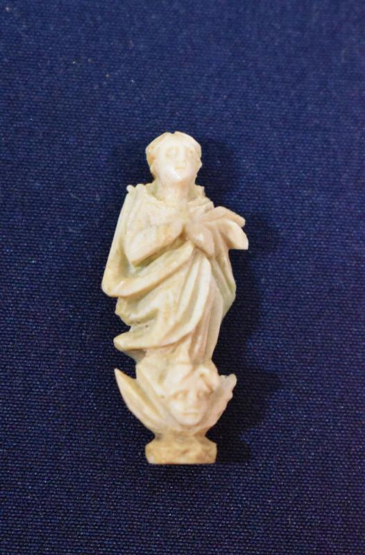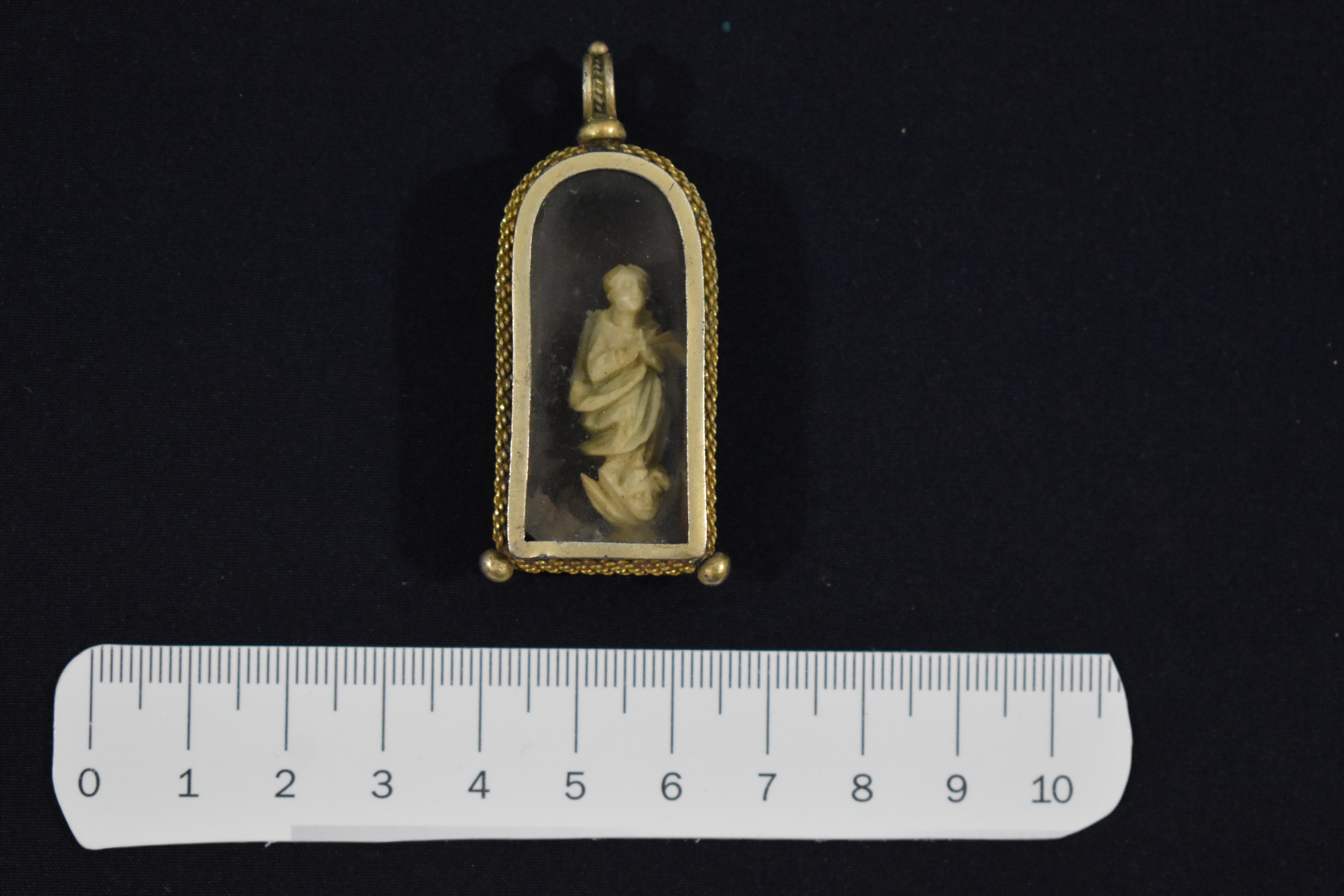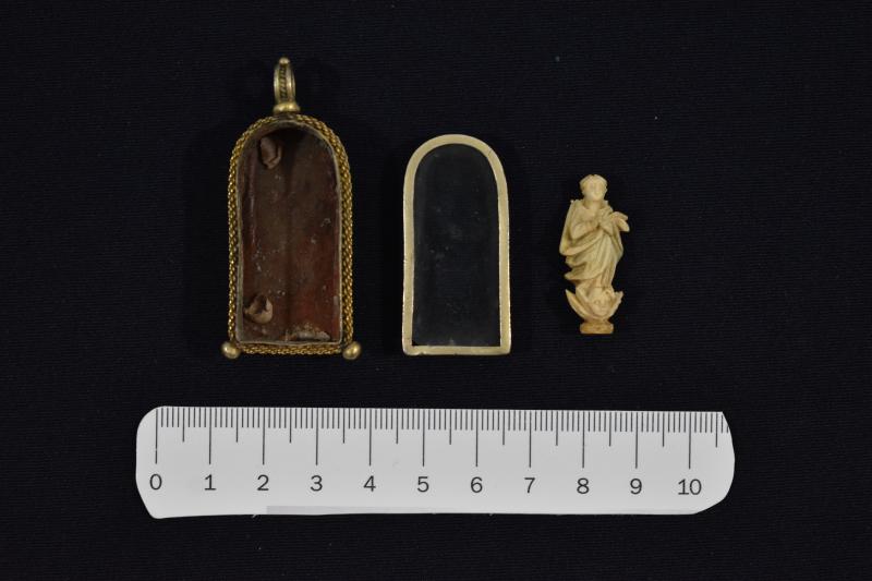 Fanal de plata dorada en forma de hornacina y vidrio. Contiene una figurilla de la Inmaculada dentro, realizada con asta o hueso