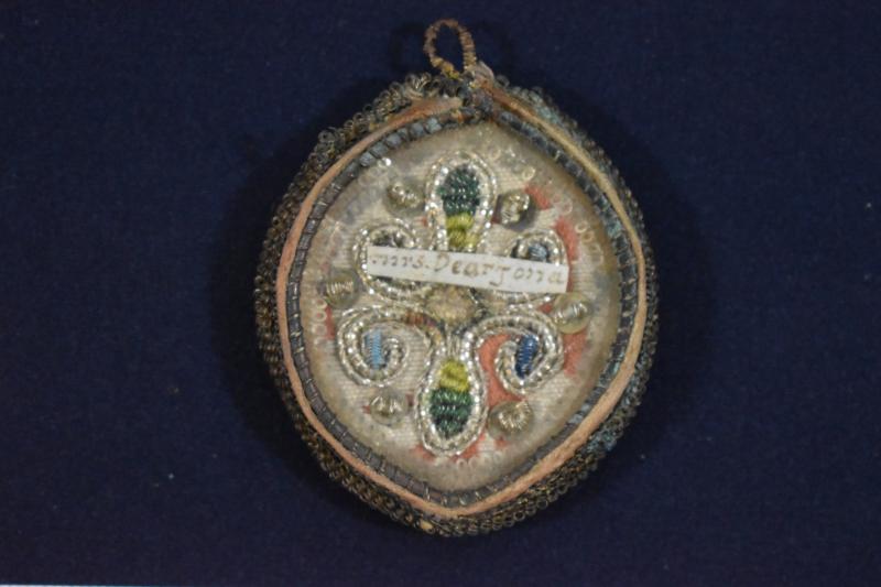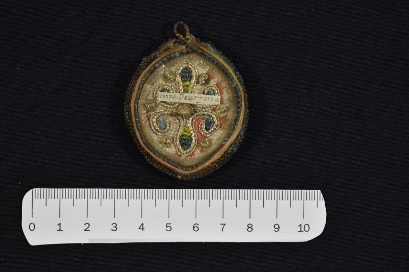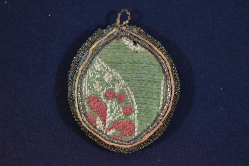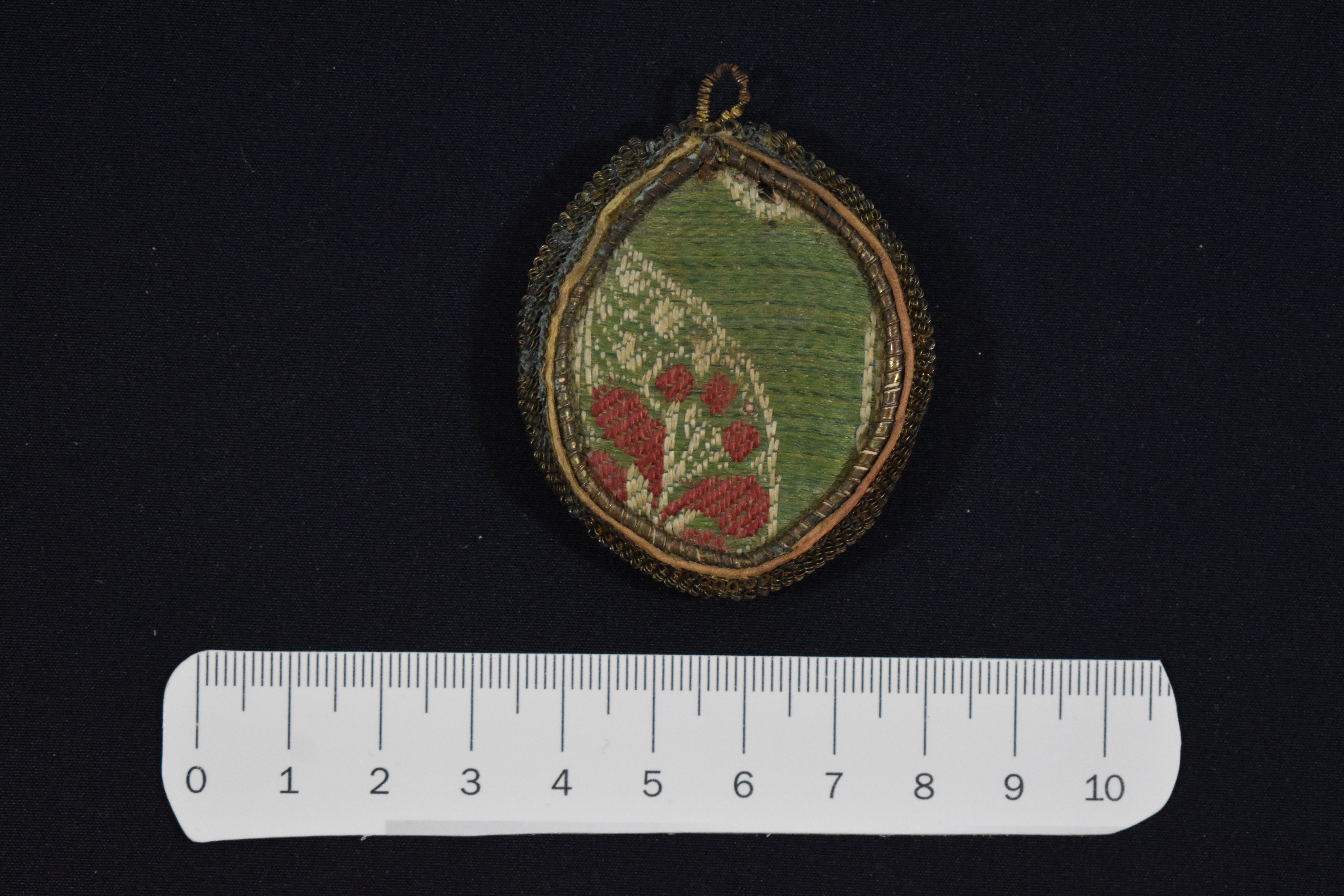 Óvalo textil con filigrana de plata (llamada en el argot "labor de monjas") con reliquia en su interior, visible a través del vidrio que la protege.