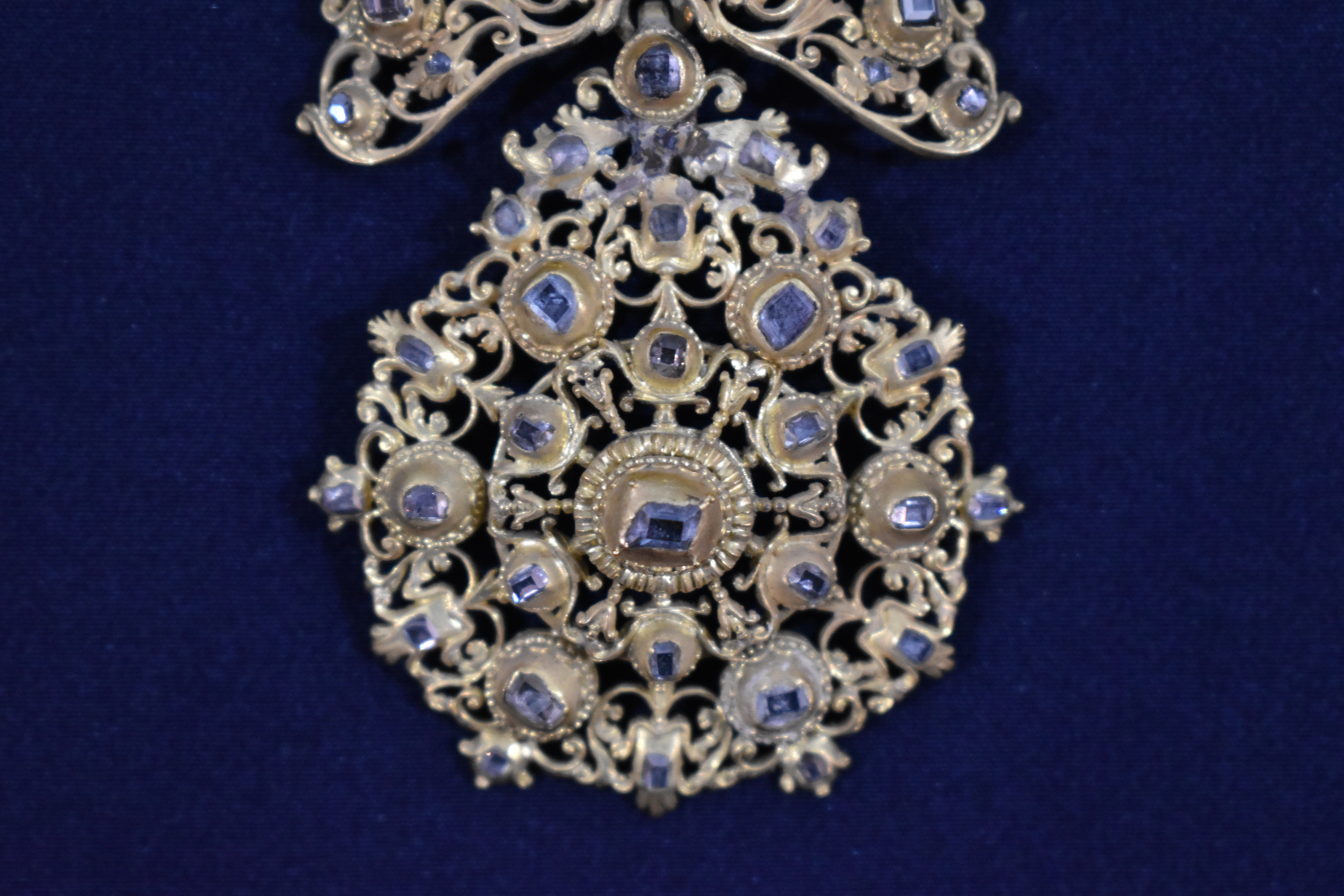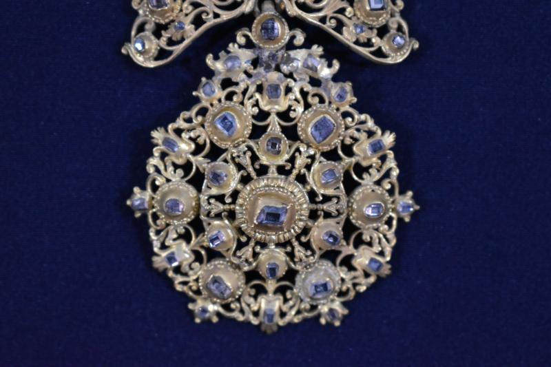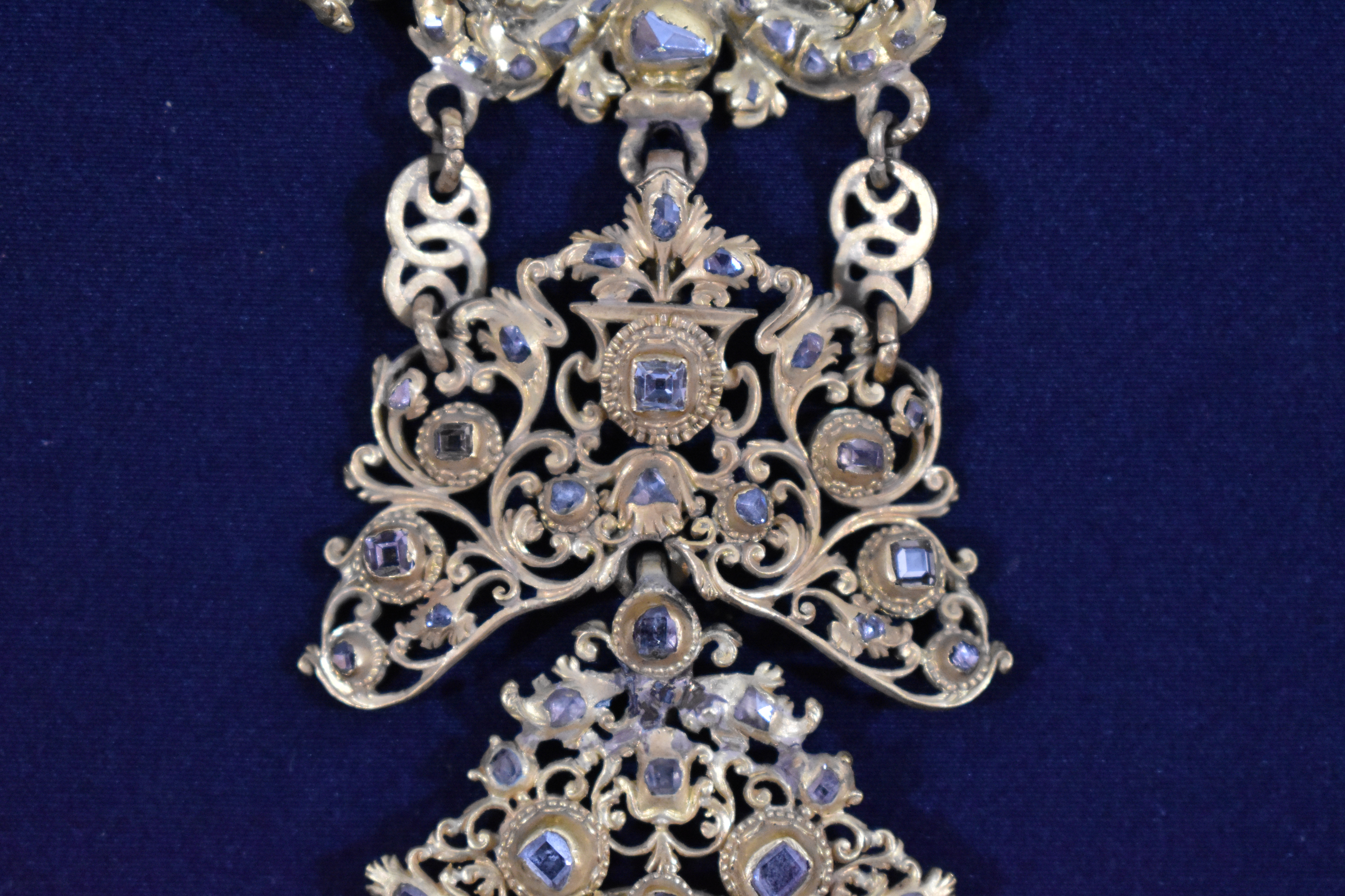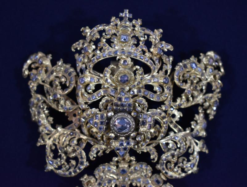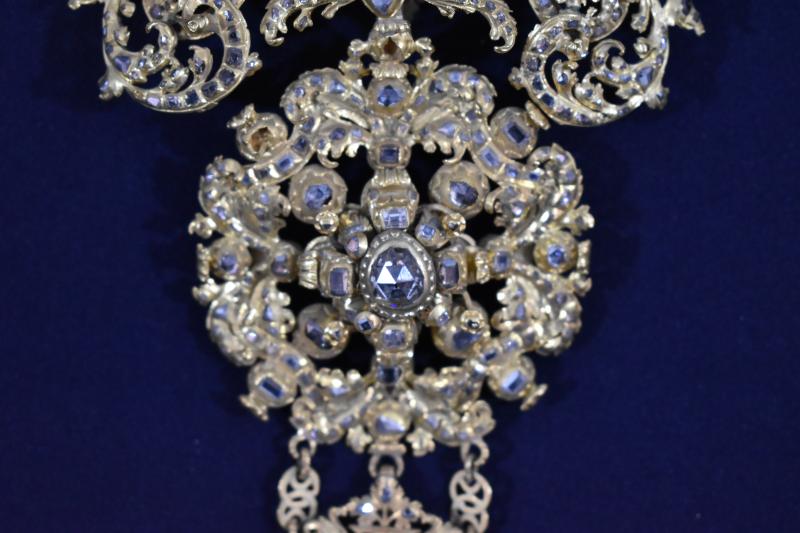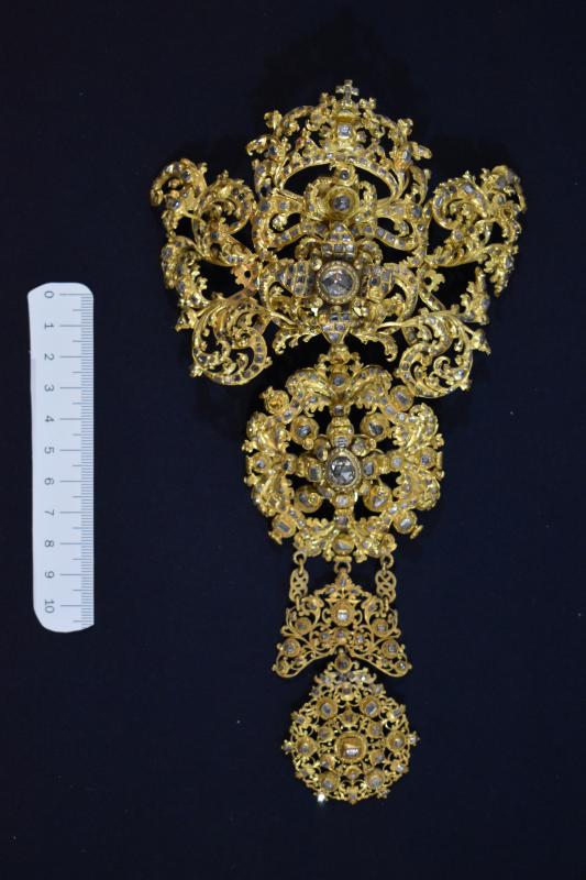 Joyel de gran formato elaborado en plata dorada y pedrería. Se compone de cuatro piezas independientes unidas entre sí por argollas de distintos tipos. La mayor es la superior y desde ahí van descendiendo en tamaño hasta la parte inferior. Es más, no es descartable que las dos inferiores se incorporaran al joyel con posterioridad pues su factura parece distinta. Todo el reproduce rameados vegetales y motivos fitomorfos que se van engarzando entre sí. Además, la parte superior para tocada por una corona. Los engastes de piedras de distinta talla son innumerables. Según la inscripción del reverso se debe a una donación de Gregorio Blanco de Laysequilla, ponferradino de nacimiento pero que acabó como letrado y oidor en la Audiencia Real de Chile en 1744, donde casó. Nunca volvió a España, muriendo en las tierras de acogida.