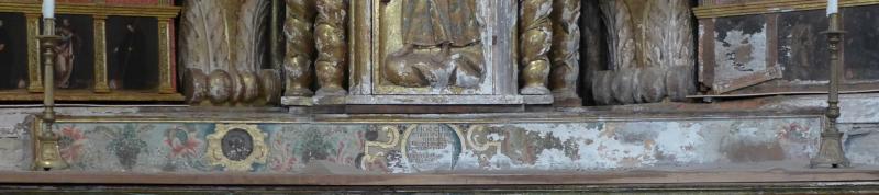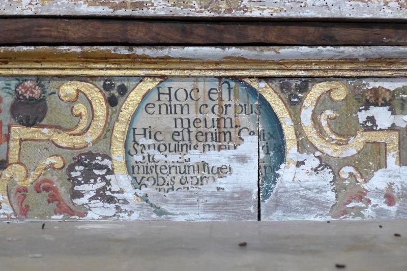 Listón estrecho y alargado de madera policromada con marco dorado. Se decora, sobre fondo azulado, con una sacra pintada en su parte central inscrita en un medallón flanqueado de aletones, ambos dorados. Inscritas (con las líneas guía visibles), las palabras de la consagración en nueve líneas, con algunas lagunas por pérdida de la capa pictórica.