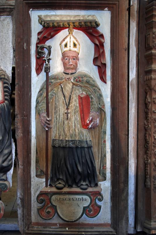 Figura en mediorelieve sobre una peana (también en mediorelieve) en la que el protagonista es identificado por su nombre: “N.P.S. GENADIO”, nuestro padre san Genadio. El fondo de la composición es blanco. Se representa bajo un dosel suspendido de la nada del que cuelgan cortinajes rojos, de pie y de frente, hierático, con los atributos episcopales (mitra, báculo y una cruz en el pecho), así como con libro cerrado de color rojo y cortes acuarelados en su mano izquierda. Viste sotana, roquete y capa pluvial (abierta, por lo que deja ver el pecho), unida por un broche. Es la única tabla de la serie en que no se aprecia el fulgor verdoso.