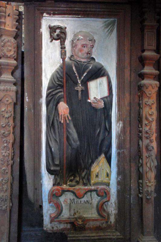 Figura en mediorelieve sobre una peana (también en mediorelieve) en la que el tonsurado protagonista es identificado por su nombre: “S. MILLAN”, san Millán. El fondo de la composición es blanco. Se representa de pie y de frente, con un ligero movimiento de su pierna derecha hacia adelante, con la cabeza ligeramente ladeada y la mirada perdida, y porta atributos episcopales (mitra, apoyada en el suelo, a su izquierda, báculo, y una gran cruz en el pecho), así como con libro abierto en su mano izquierda. Viste hábito benedictino, rico en plegados. Viste hábito benedictino, rico en plegados. Un rudimentario fulgor verdoso asoma desde el ángulo superior derecho (según se mira) de la composición.