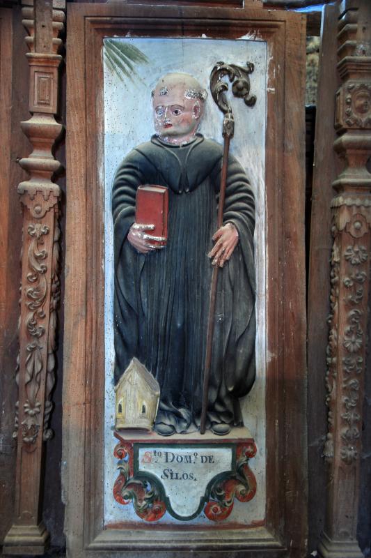 Figura en medio relieve sobre una peana (también en medio relieve) en la que el tonsurado protagonista es identificado por su nombre: “Sto. DOM.º DE SILOS”, santo Domingo de Silos. El fondo de la composición es blanco. Se representa de pie y de frente, con la cabeza ligeramente ladeada y la mirada perdida, y porta atributos episcopales (mitra, apoyada en el suelo, a su derecha, y báculo), así como con libro cerrado de color rojo en su mano derecha. Un rudimentario fulgor verdoso asoma desde el ángulo superior izquierdo (según se mira) de la composición.
