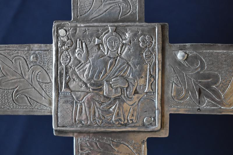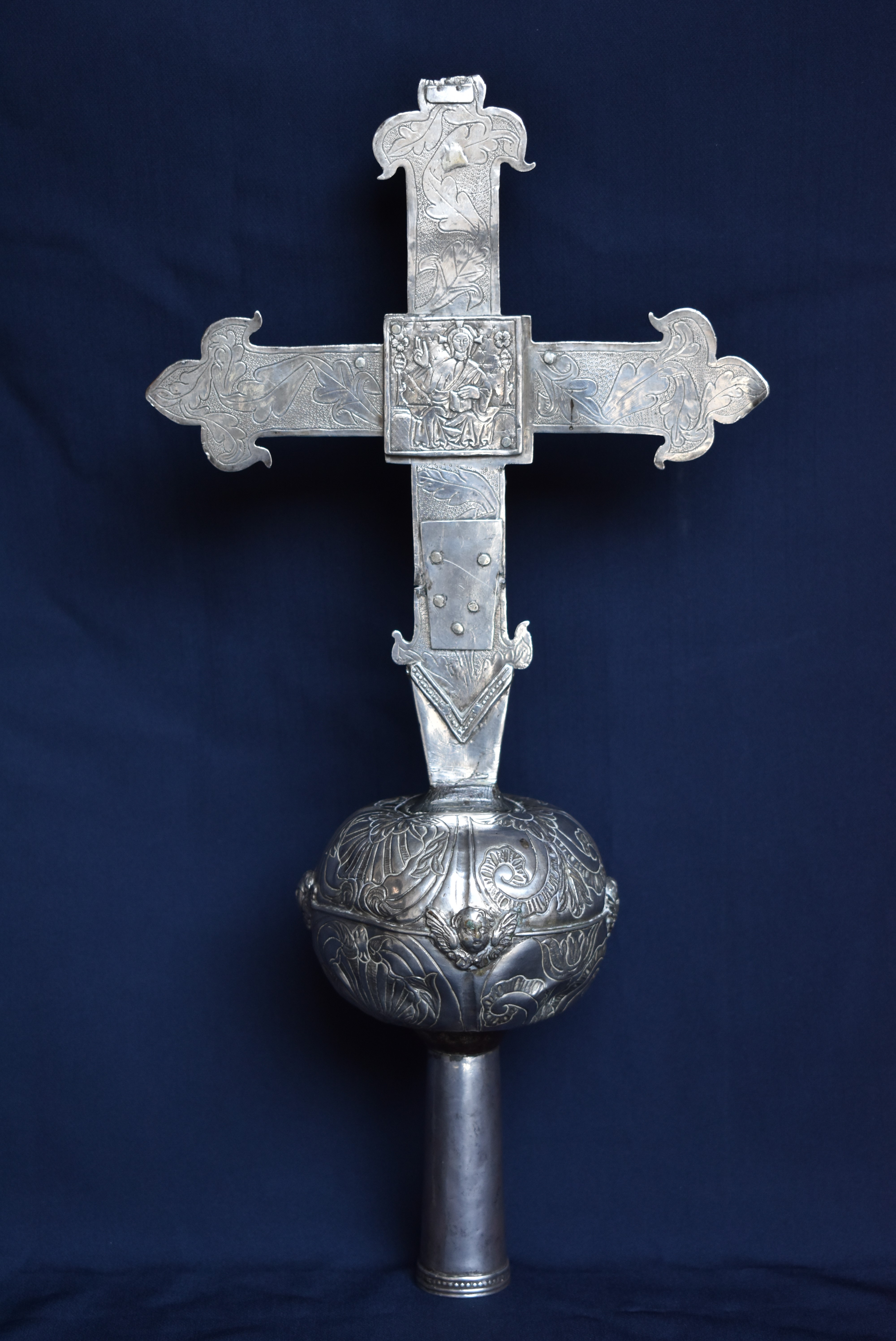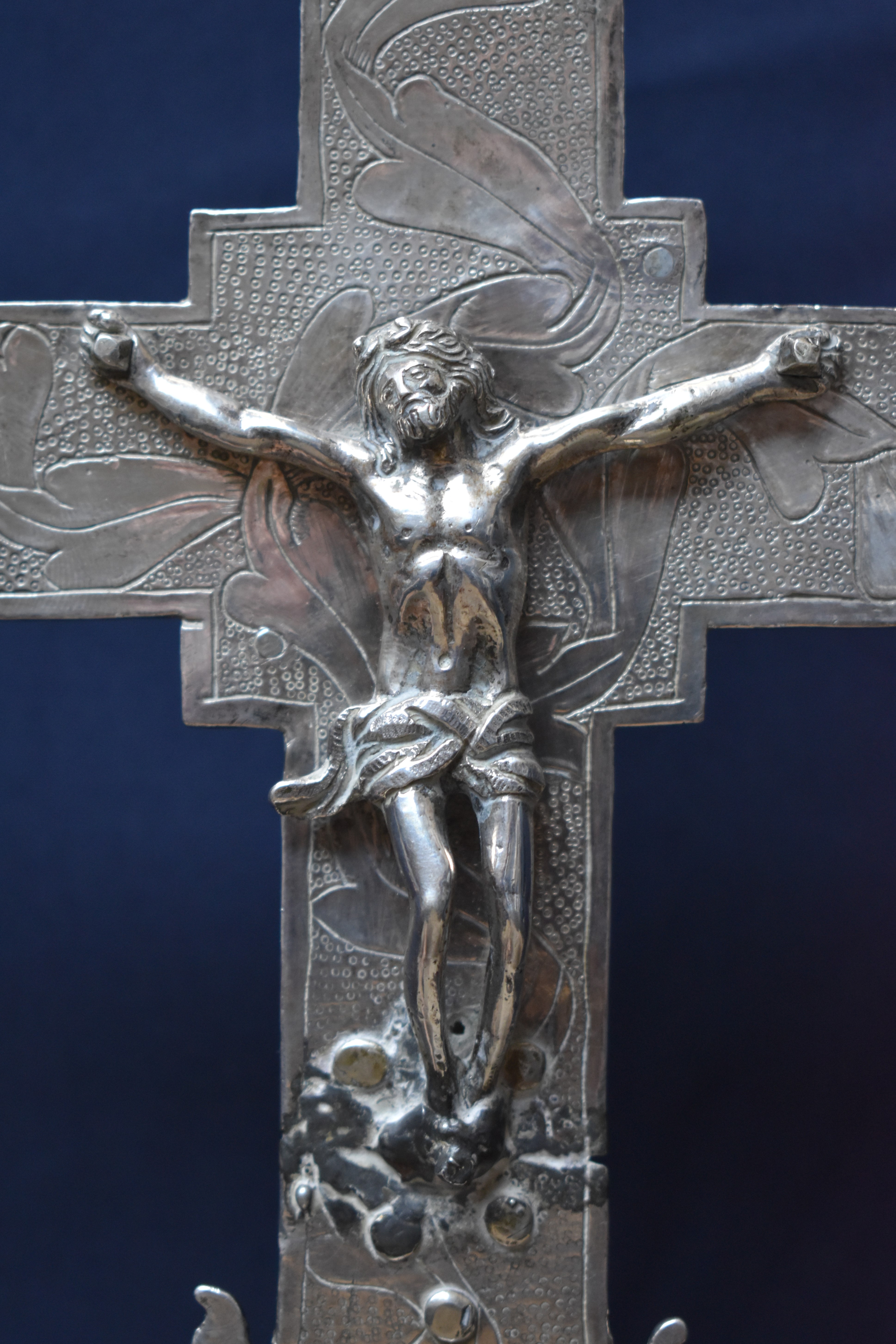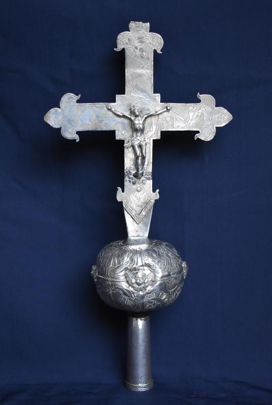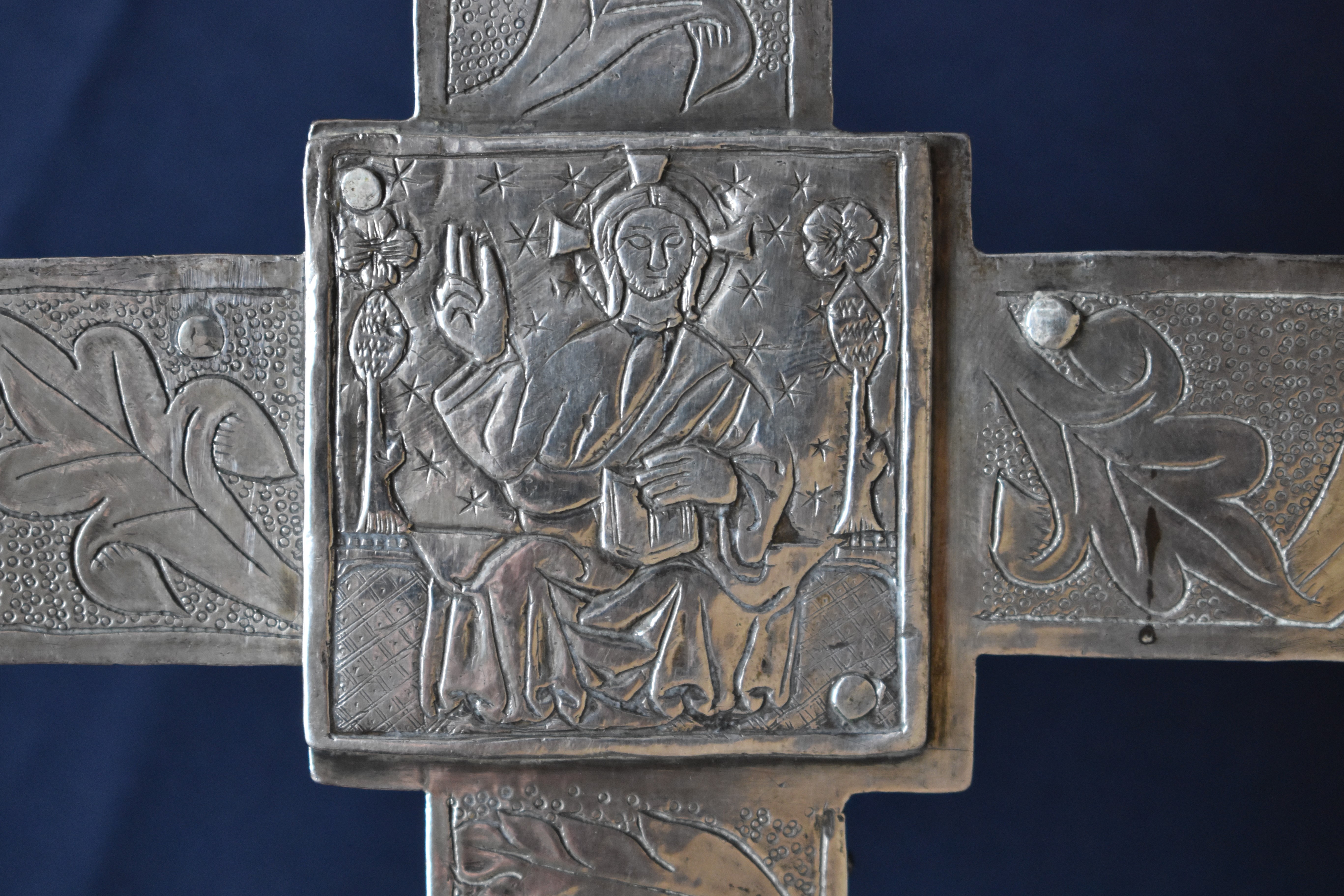 Junto con la conocida cruz de esmaltes, esta quizá sea el ejemplar más antiguo de cuantos tuvo la parroquial de Villanueva. Conecta este ejemplar con una tipología de cruces de profundo arraigo en la Tebaida berciana, elaboradas en una fina plancha de plata martilleada, grabada y trabajada a dos haces de manera más o menos elaborada (ejemplar bien conocido es el de la iglesia de Santo Tomás de las Ollas). Tiende su perfil a la cruz griega, con brazos lisos, terminaciones flordelisadas y cuadrón central cuadrangular. Toda su superficie va cuajada de rameados vegetales y fondo punteado. Sobre el cuadrón del anverso se aplicó un crucificado de cronología posterior, sobre el del reverso una placa cuadrangular (esta sí coetánea a la cruz) con un Cristo en Majestad.
